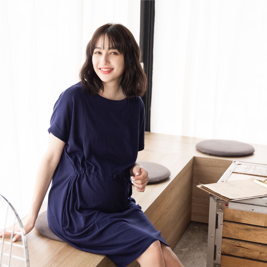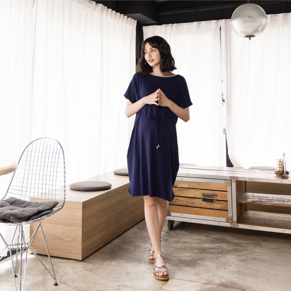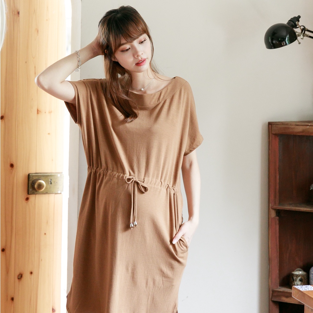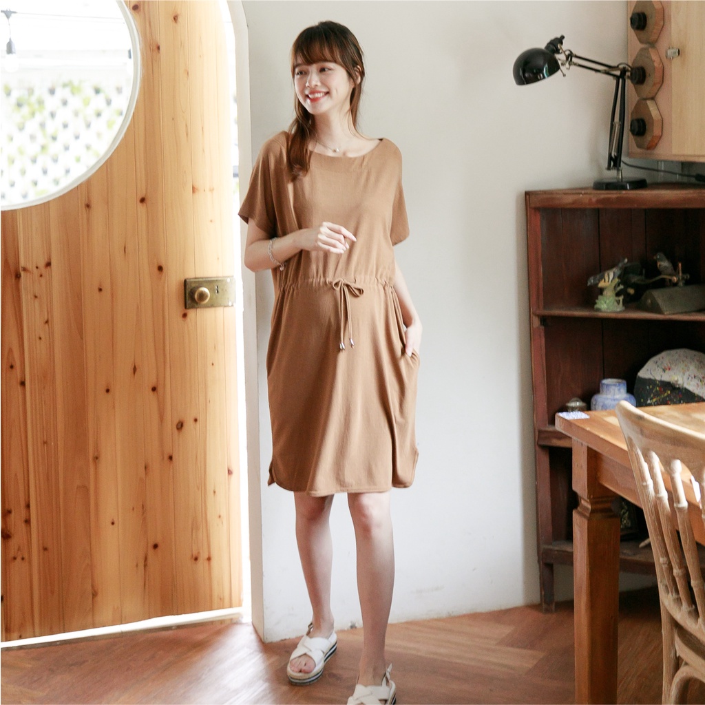 Mamamia孕婦裝 素面腰抽繩短洋裝 台灣製 孕婦裝 短袖 孕婦裙 孕婦連身裙 連身洋裝 孕婦洋裝 [D7135]咖啡|綠|黑|深藍Maternity DressesMamamia孕婦裝