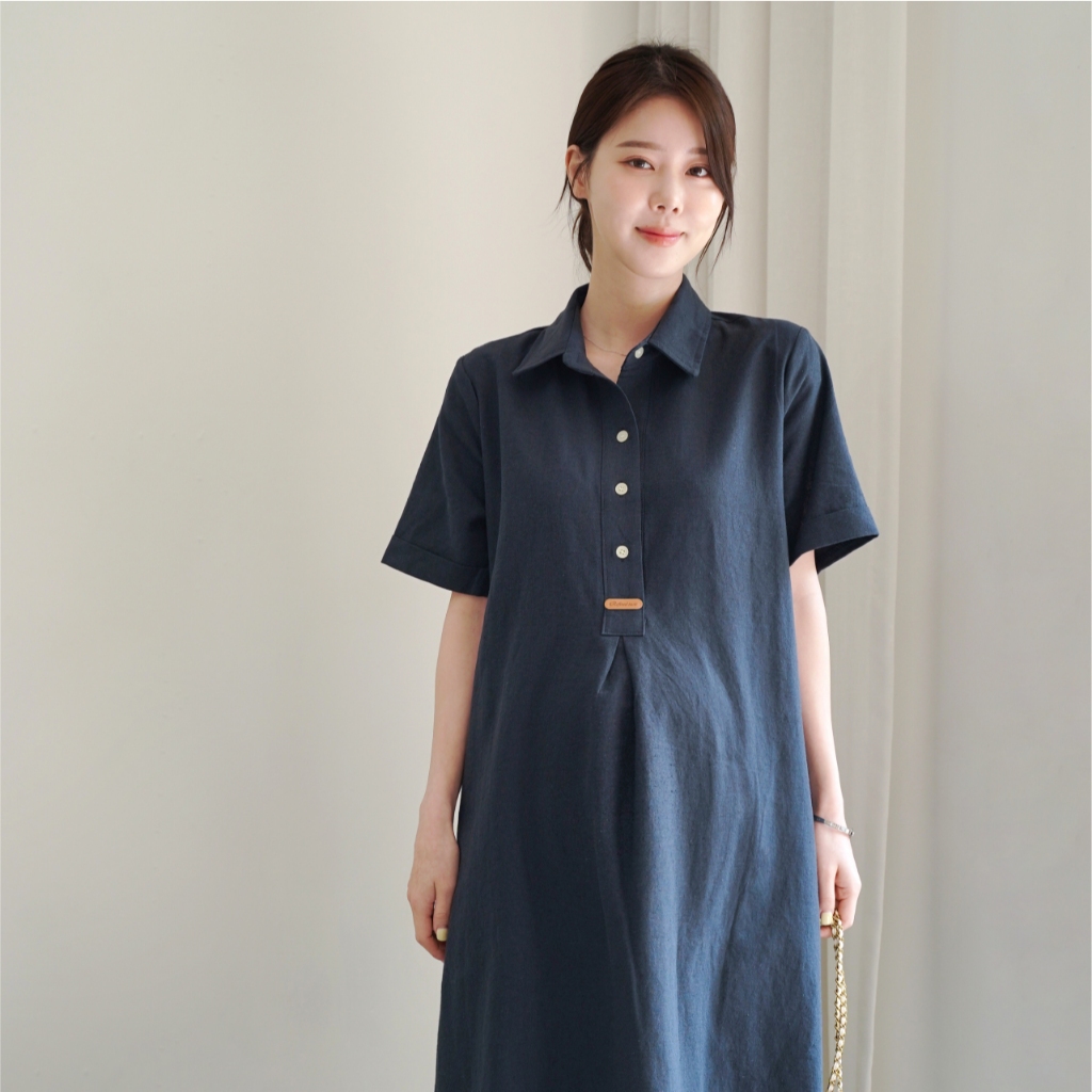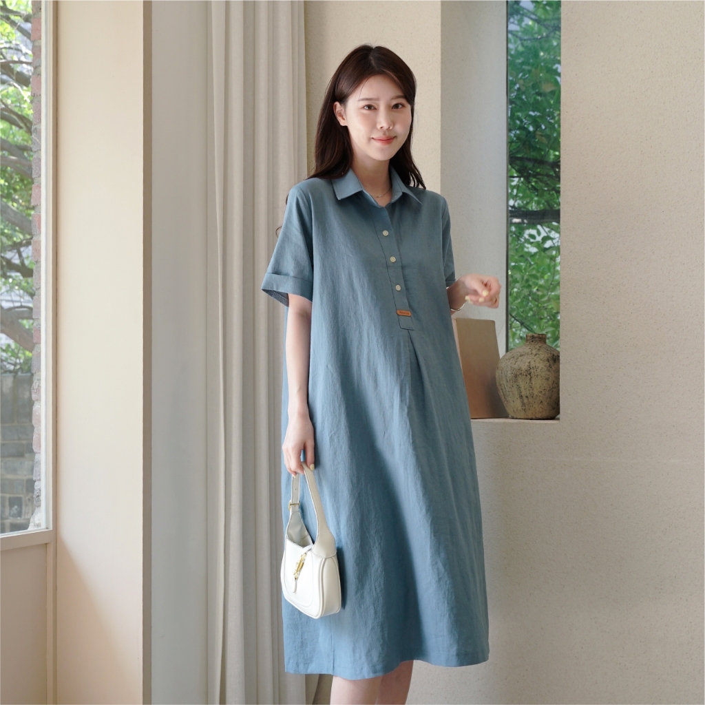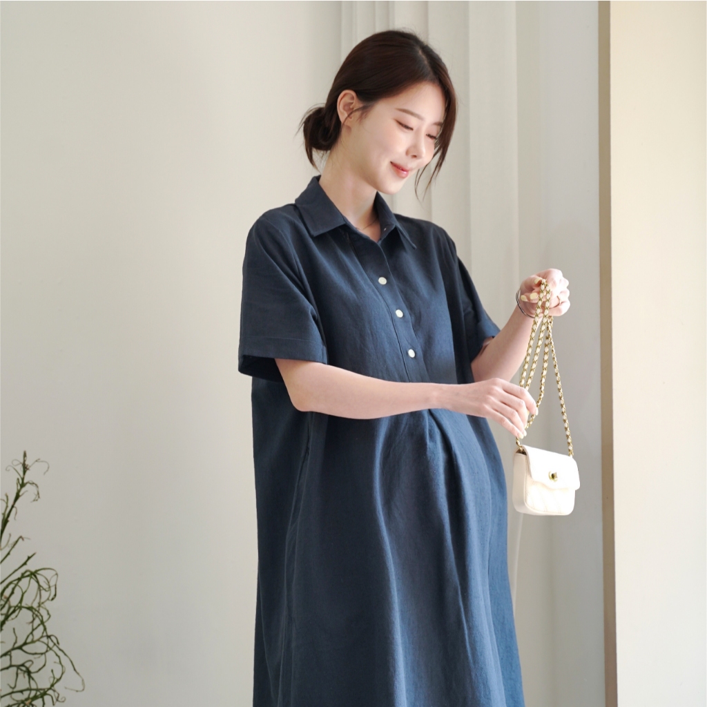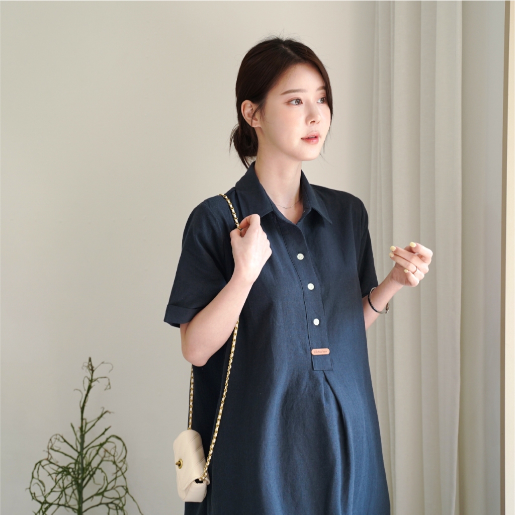 Mamamia孕婦裝 直角肩俐落麻質孕婦洋 正韓製 孕婦裙 洋裝 短袖 連身洋裝 孕婦洋裝 [D7617]深藍|淺藍Maternity DressesMamamia孕婦裝