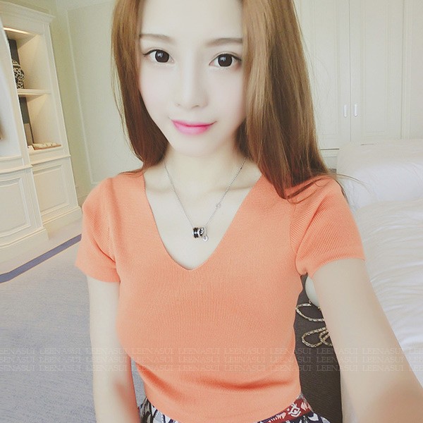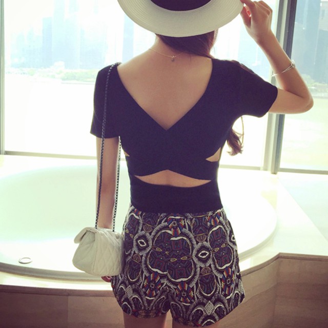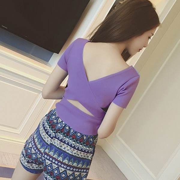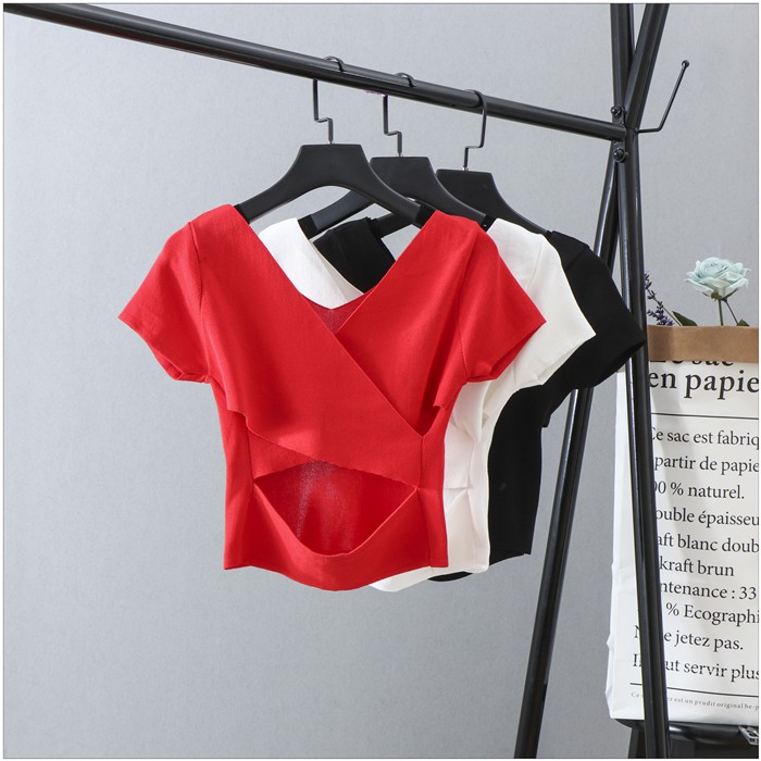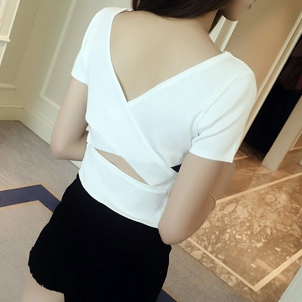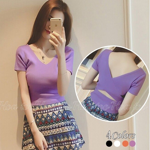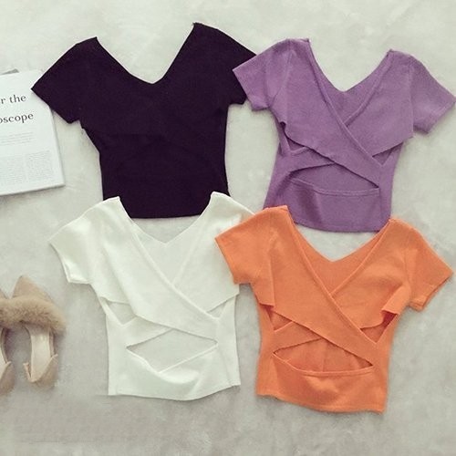 上衣 露背針織上衣 韓版小心機後背交叉短版 顯瘦 上衣 020210黑|白|紫|桔|藍|紅T-shirtsLeenaSui ~台灣賣家 隔日到貨