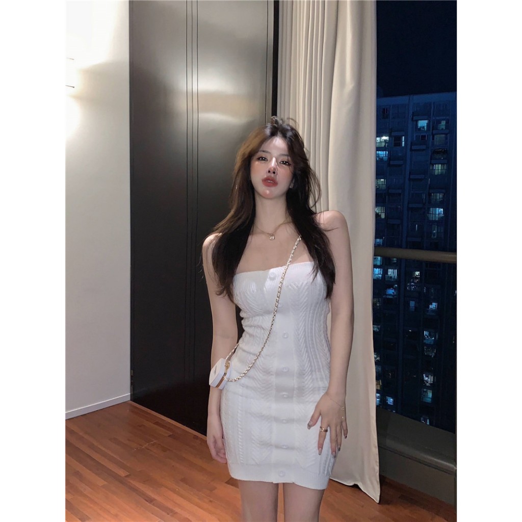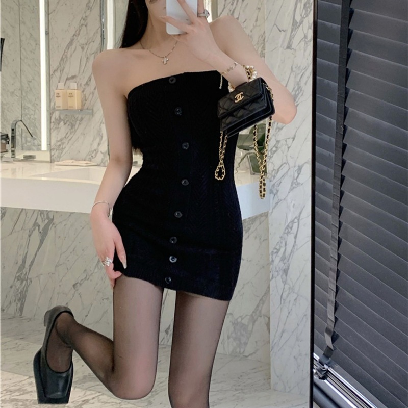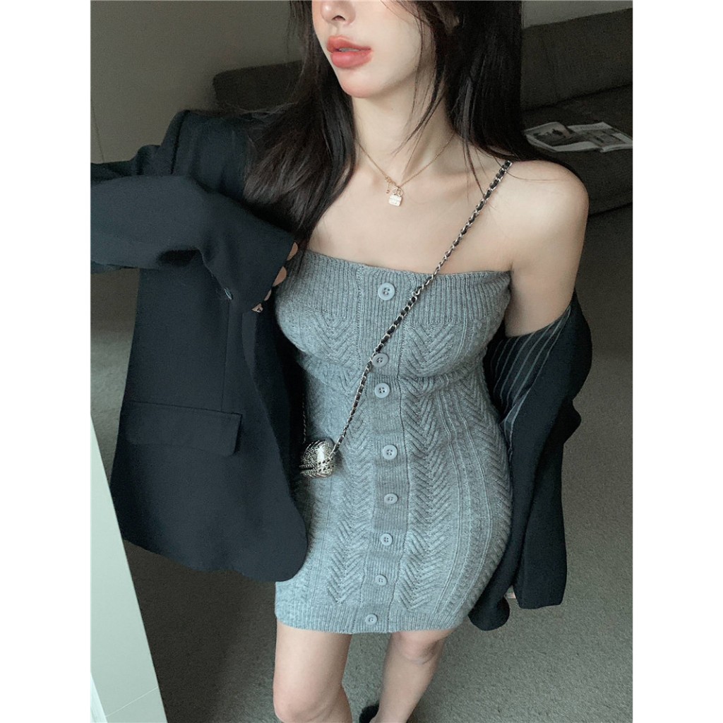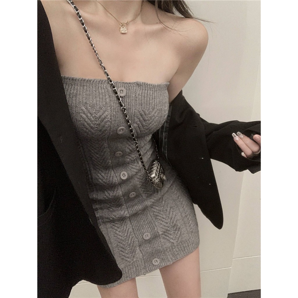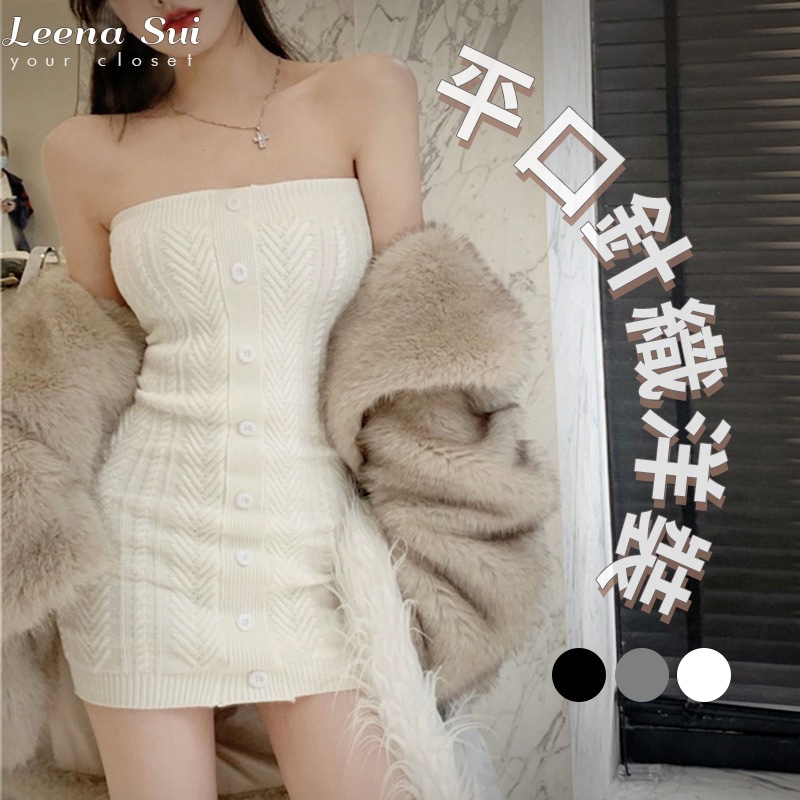 平口針織洋裝 露鎖骨針織洋裝修身性感辣妹抹胸毛衣裙包臀裙069614白|灰|黑LeenaSui ~台灣賣家 隔日到貨