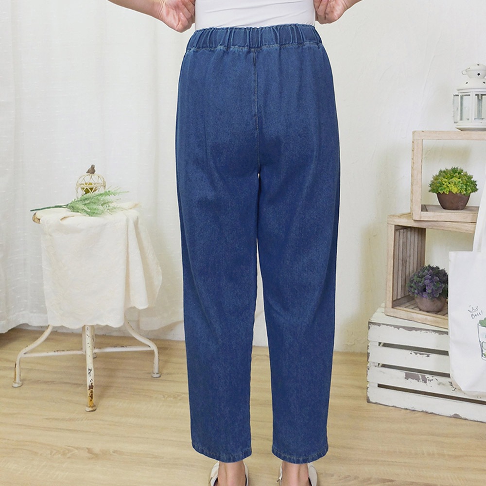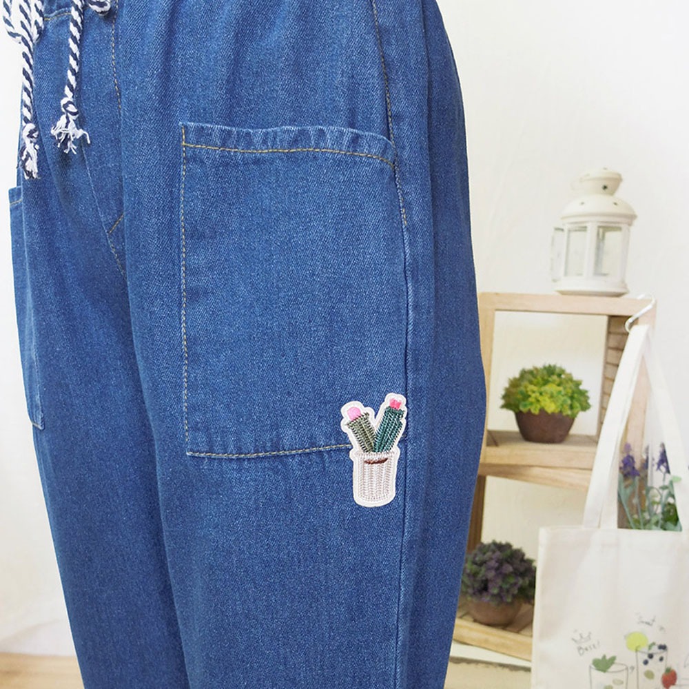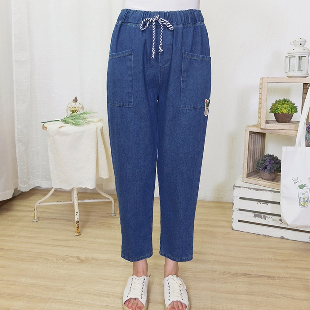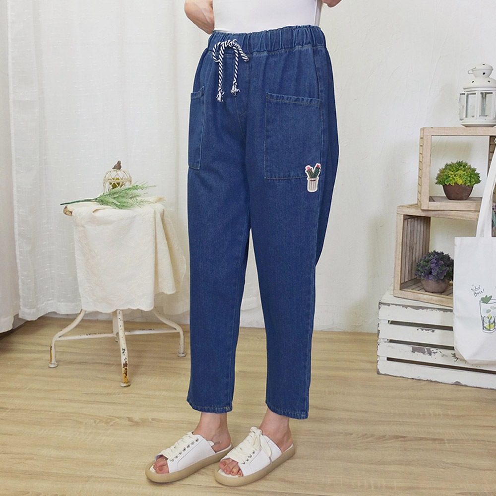 花木馬日系女裝綁帶鬆緊腰細緻繡標休閒寬鬆牛仔褲深藍牛仔hana_mokuba花木馬