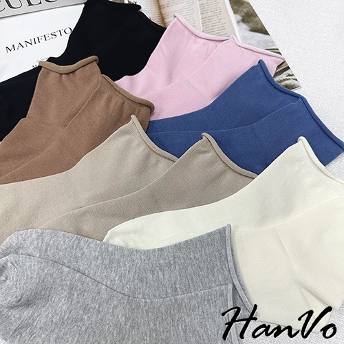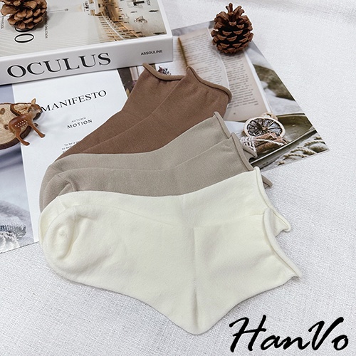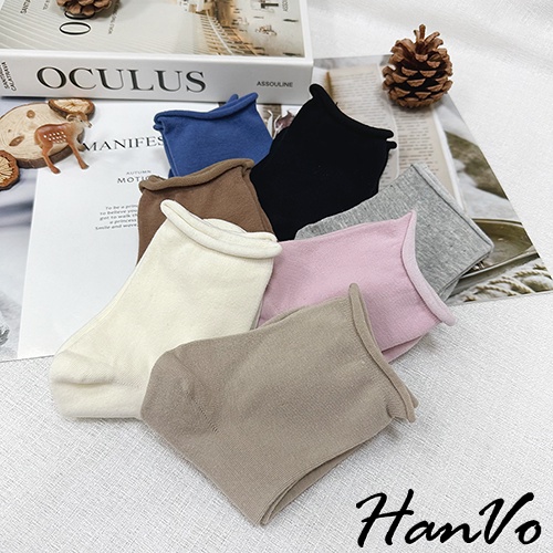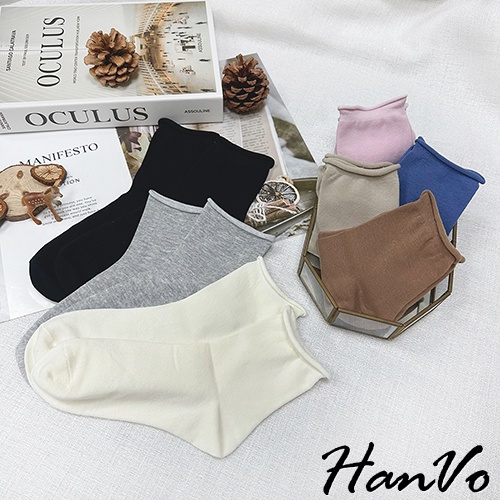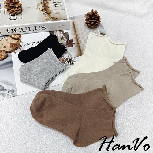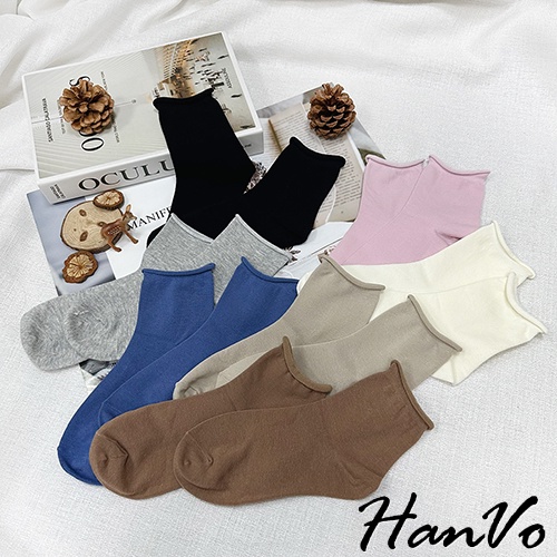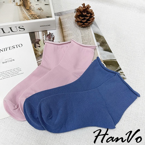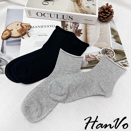 【HanVo】日常微捲邊多色素面中筒襪 韓系簡約百搭舒適柔軟棉質襪 韓國潮流時尚休閒襪 女生配件 A12-6171奶白|燕麥|咖啡|藍色|淡粉|黑色|灰色SocksHanVo Wear Collection