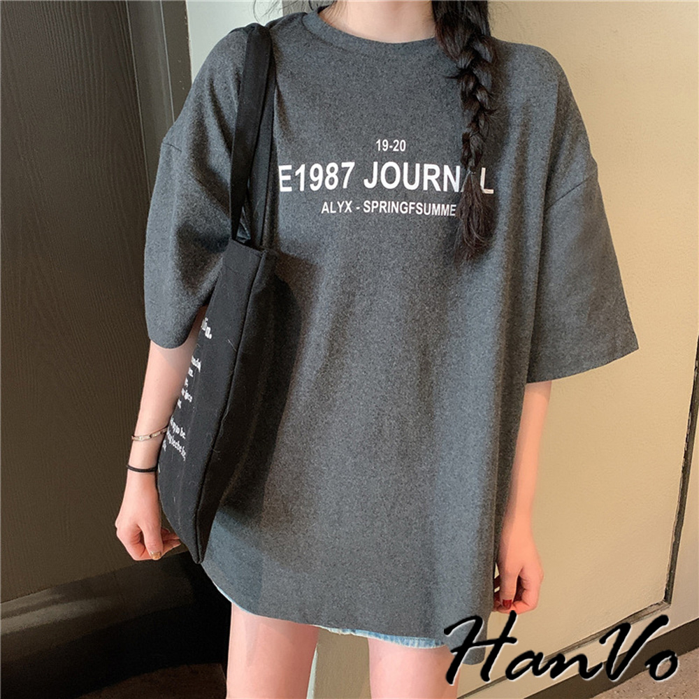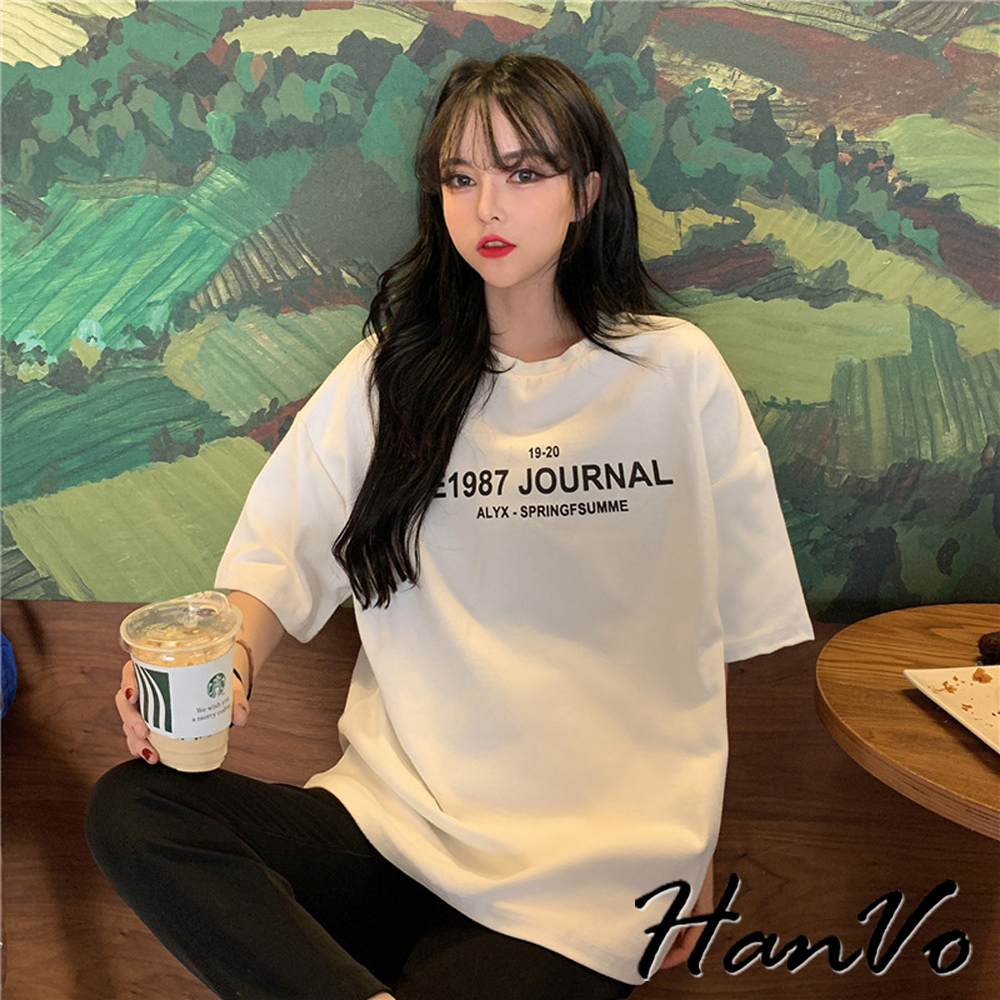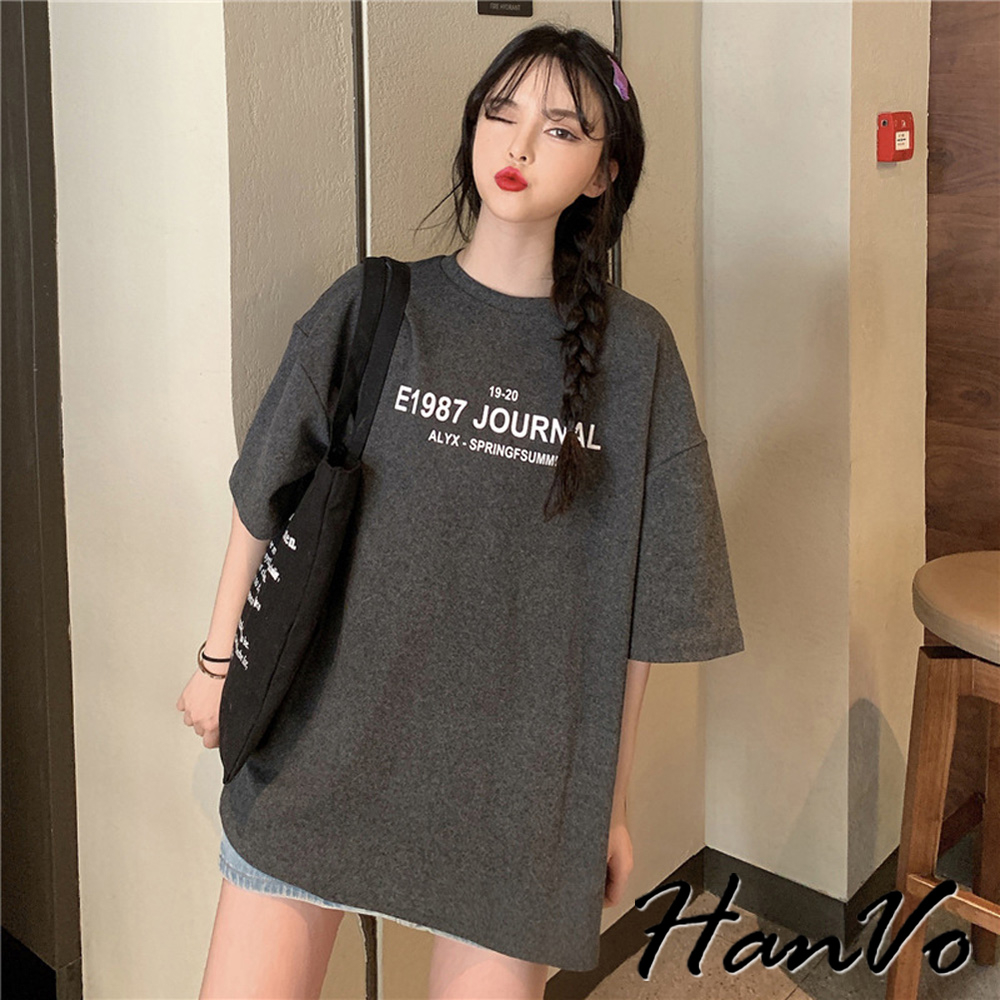 【HanVo】寬鬆1987字母印花親膚T恤 舒適棉質透氣百搭中長版上衣 簡約日常T 女裝 女生衣著 A01-0043灰色|黑色|白色T-shirtsHanVo Wear Collection