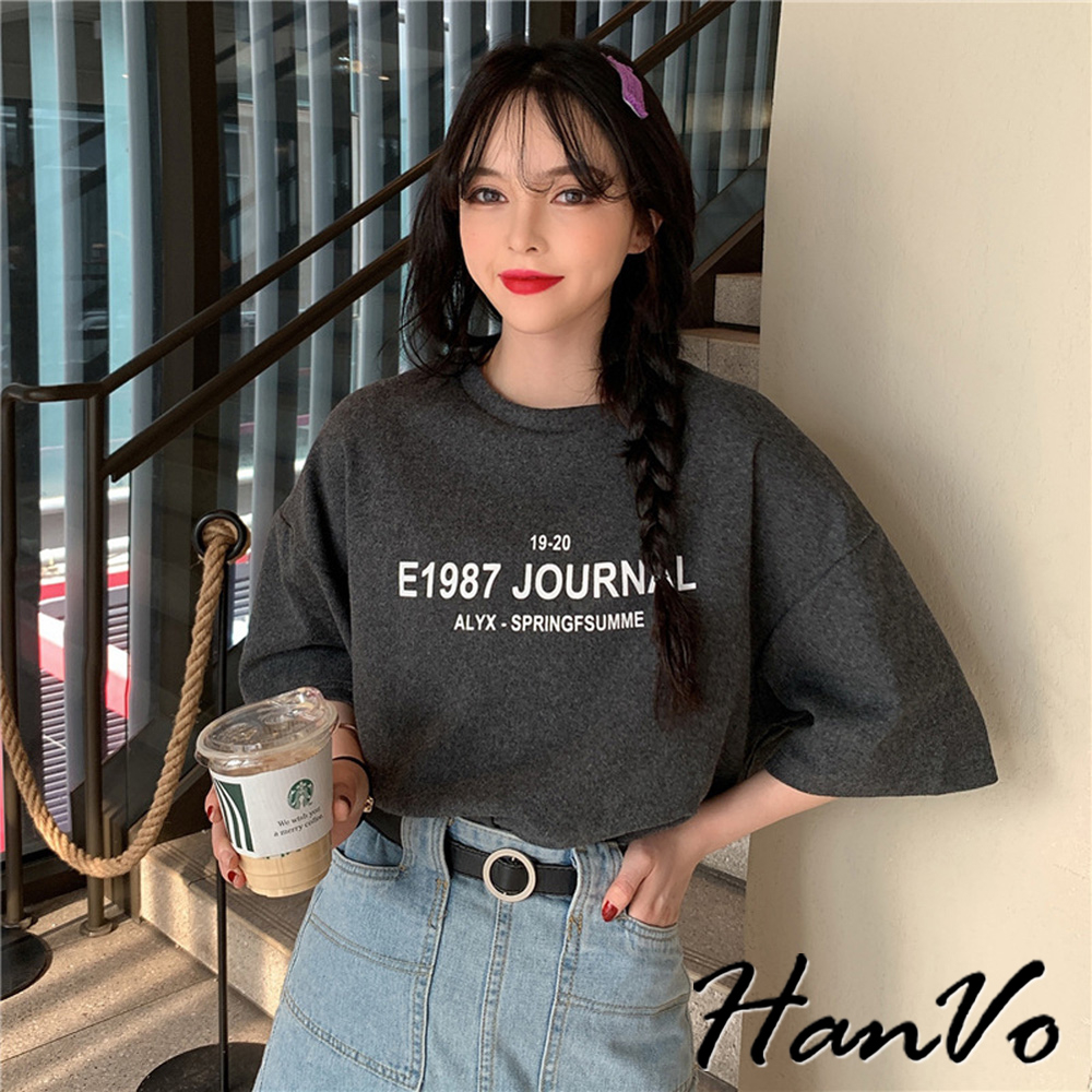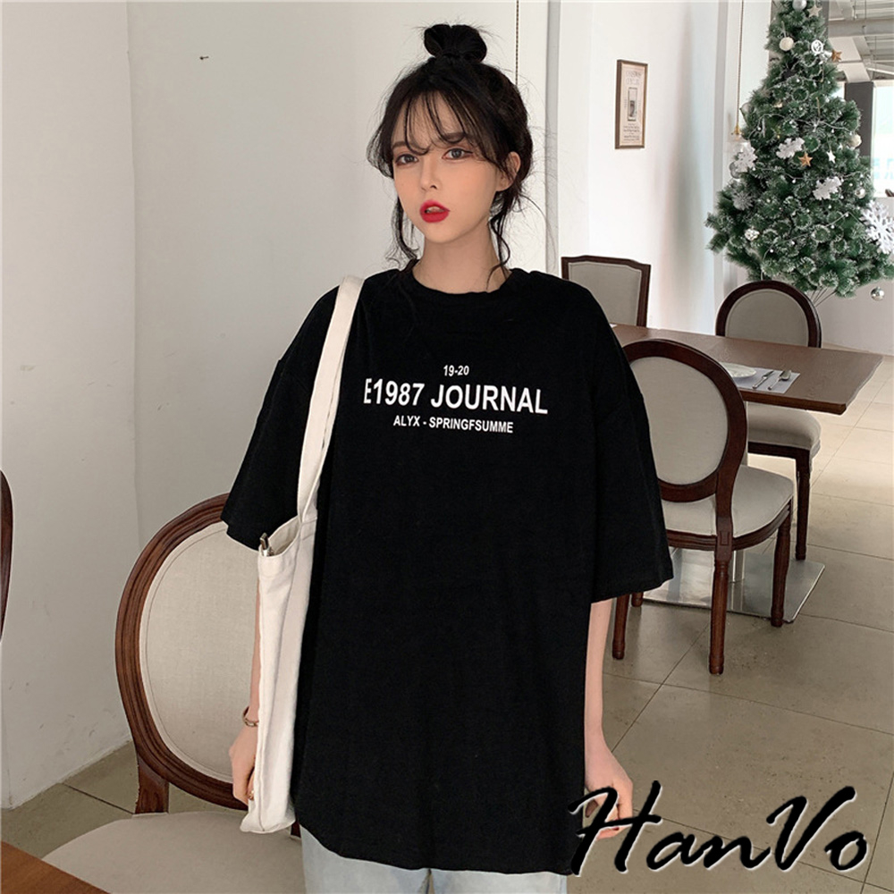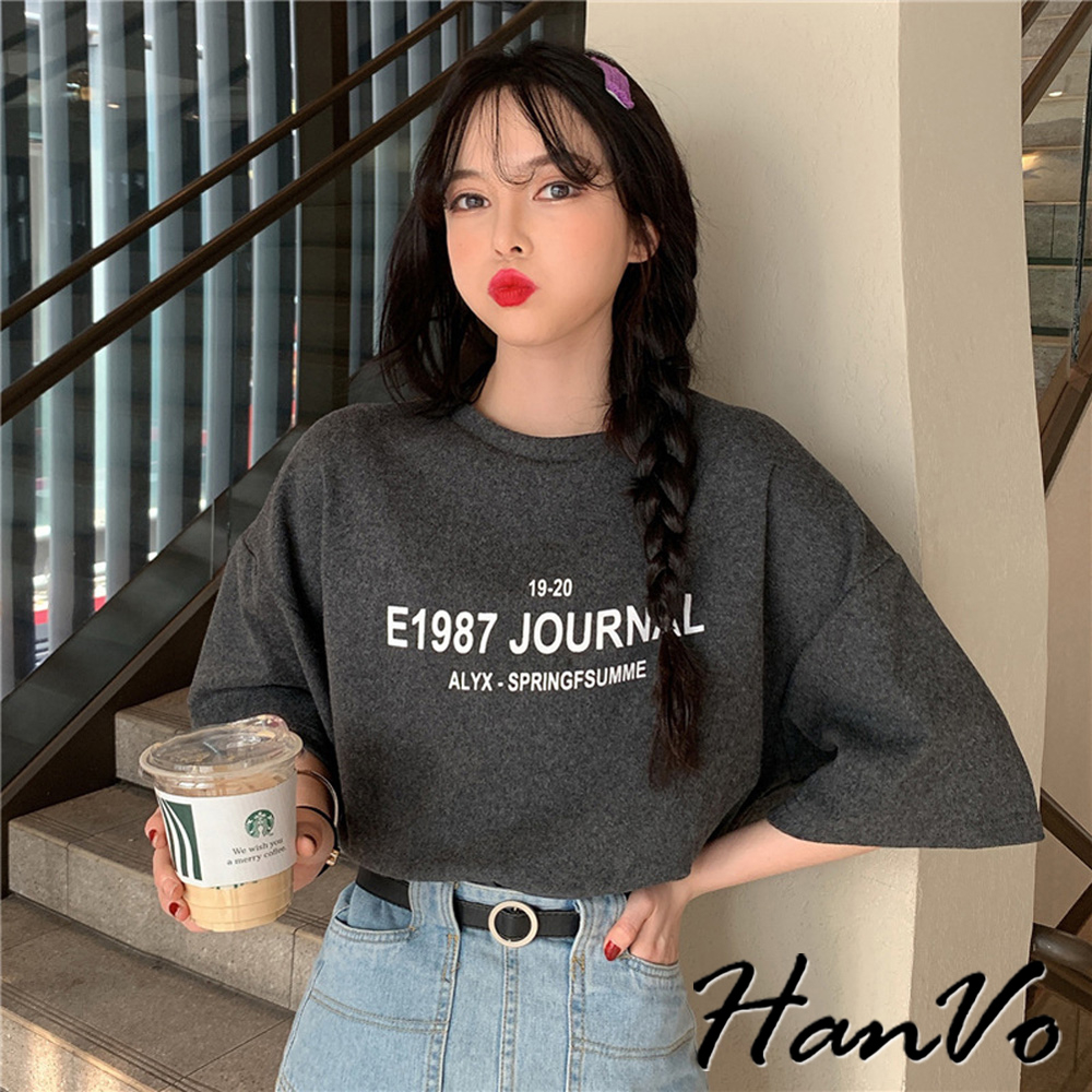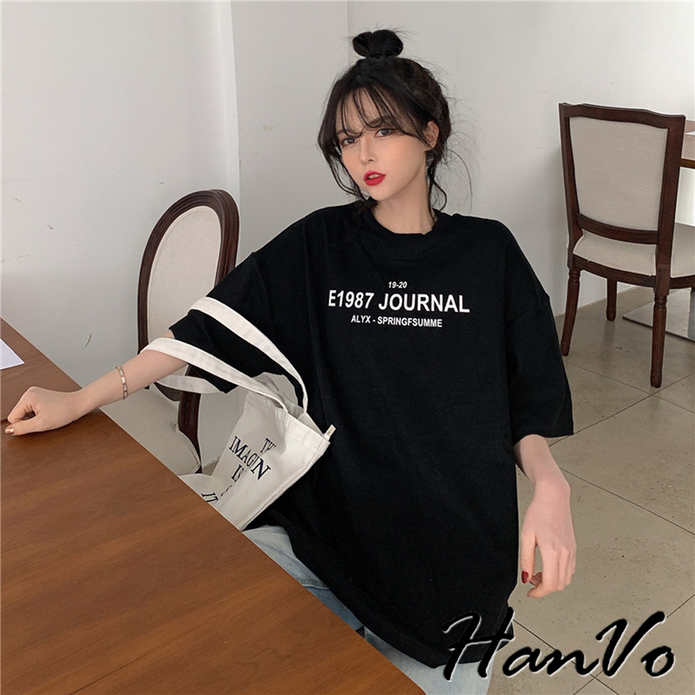 【HanVo】寬鬆1987字母印花親膚T恤 舒適棉質透氣百搭中長版上衣 簡約日常T 女裝 女生衣著 A01-0043灰色|黑色|白色T-shirtsHanVo Wear Collection