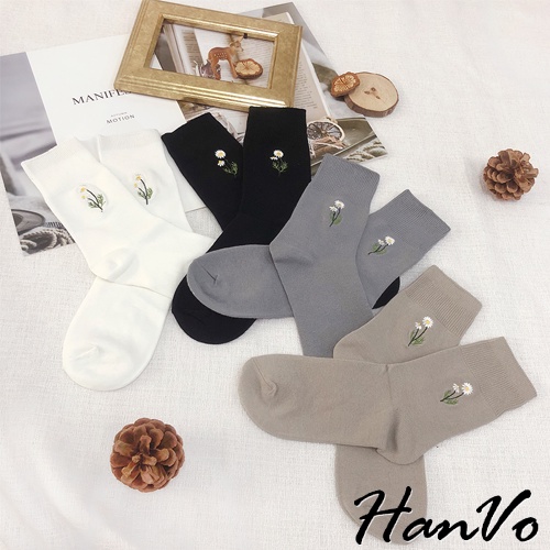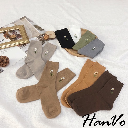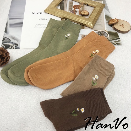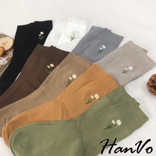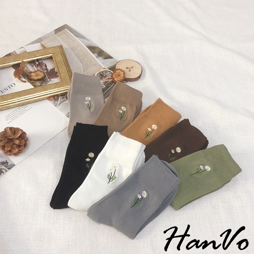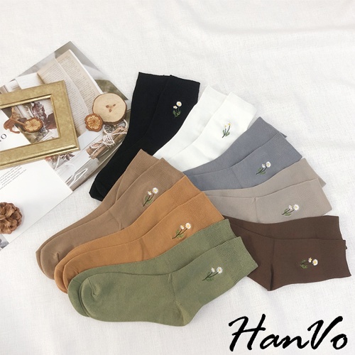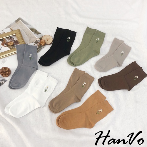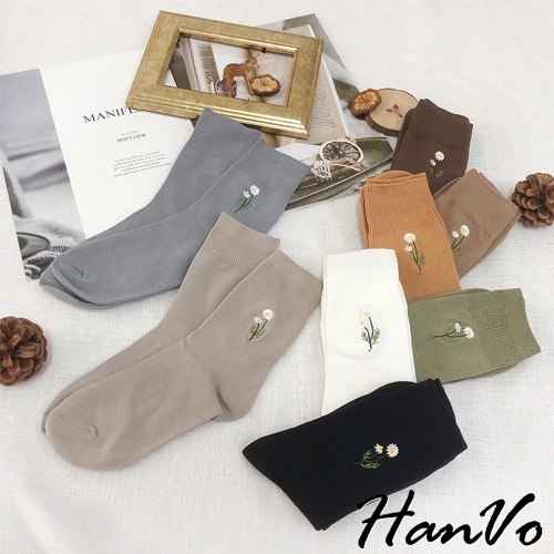 【HanVo】溫柔小花刺繡中筒襪 韓國潮流時尚休閒襪 韓系簡約百搭舒適棉質襪 中筒襪 襪子 女生配件 A12-6087燕麥灰|黑色|霧綠|日落橘|霧灰藍|白色|深咖|奶茶|薰香紫SocksHanVo Wear Collection