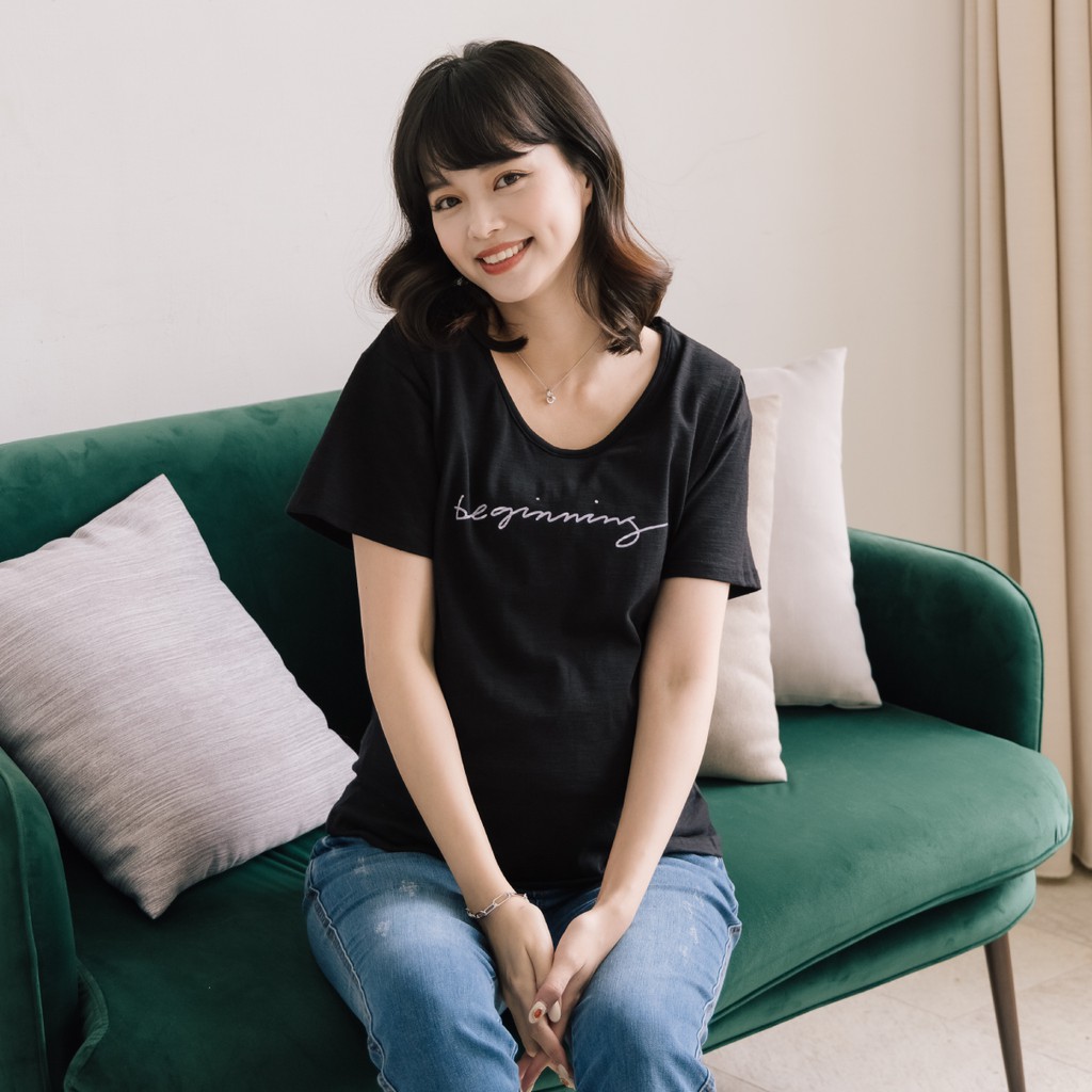 【HanVo】慵懶感落肩壓印字母T恤 韓版休閒百搭顯瘦圓領短袖上衣 韓國簡約時尚T恤 女生衣著 A01-1247黑色|白色|淺磚橘|霧灰T-shirtsHanVo Wear Collection