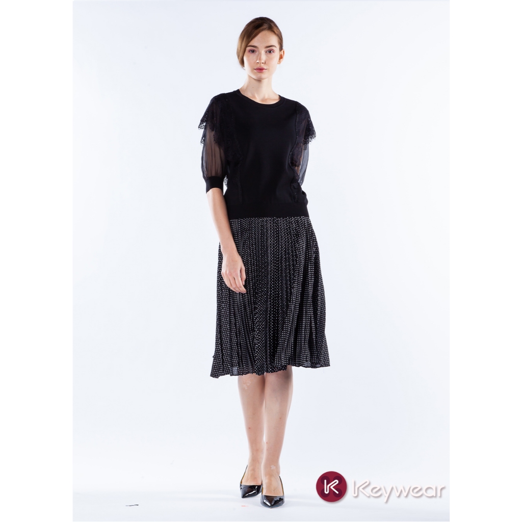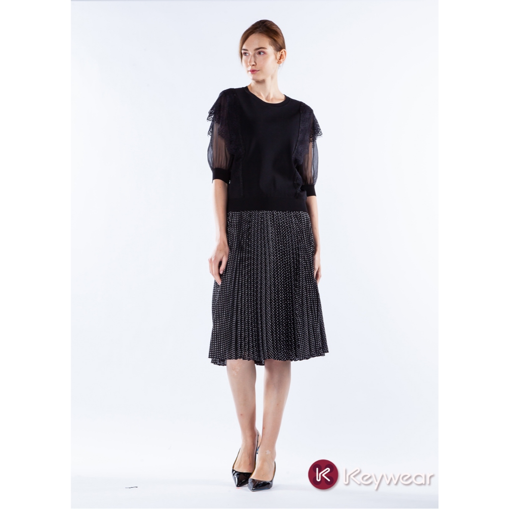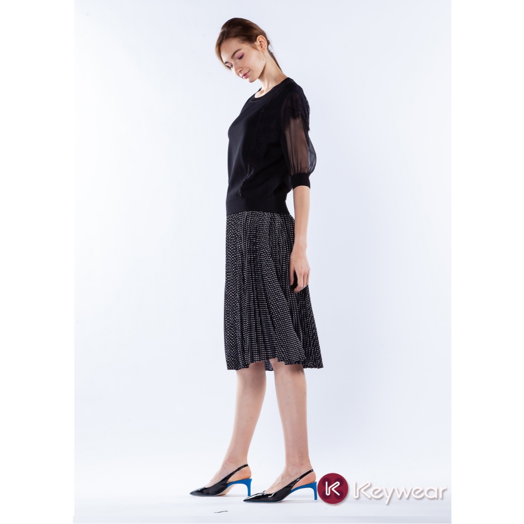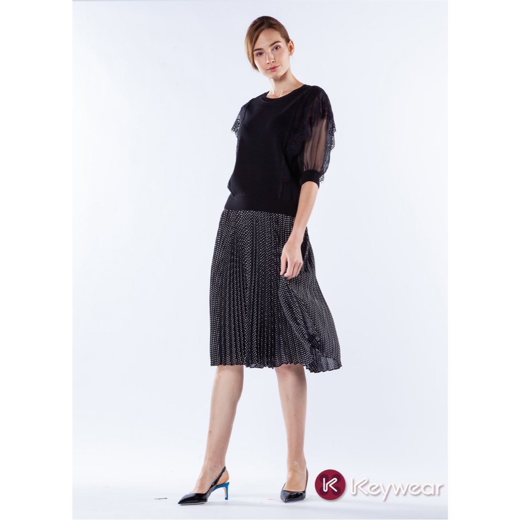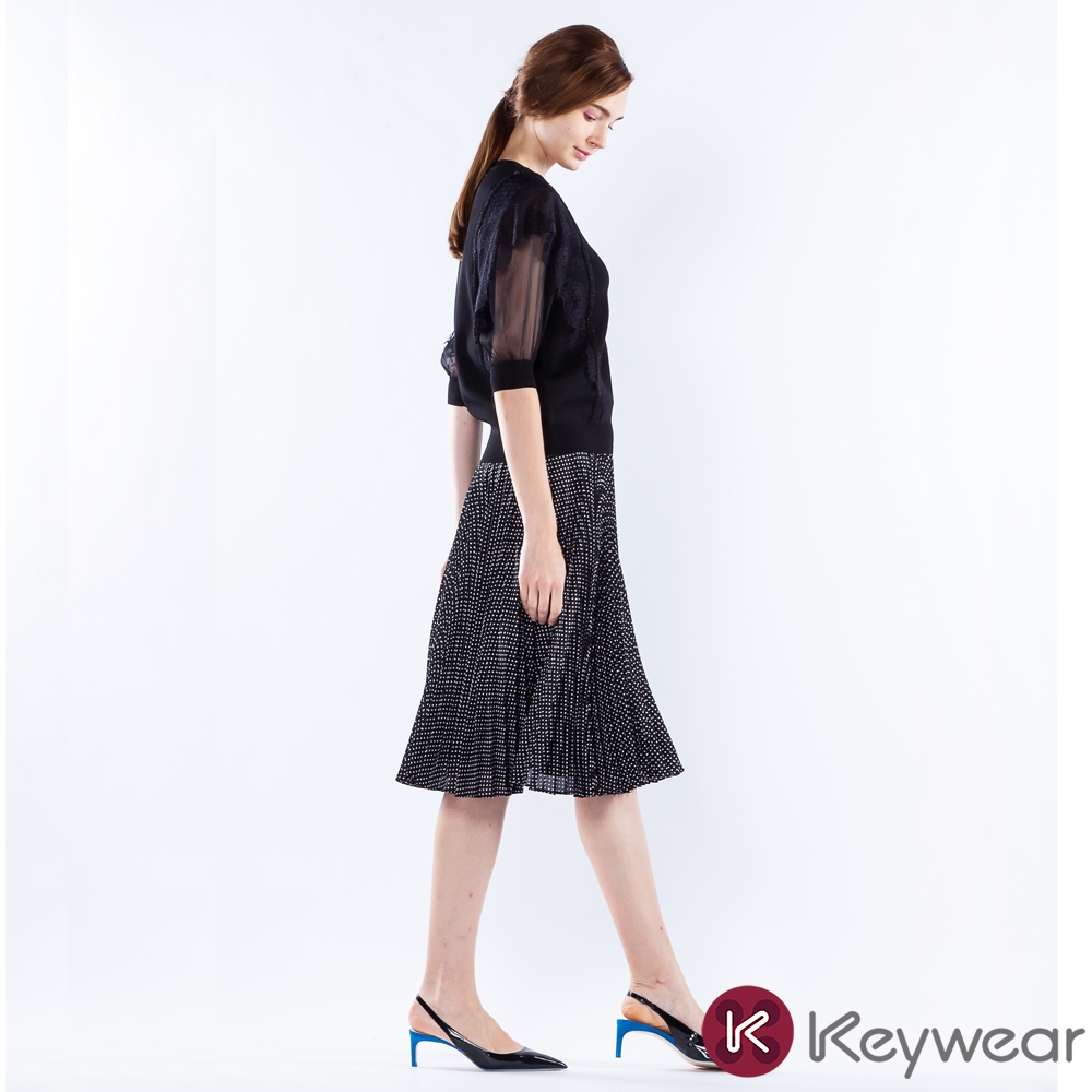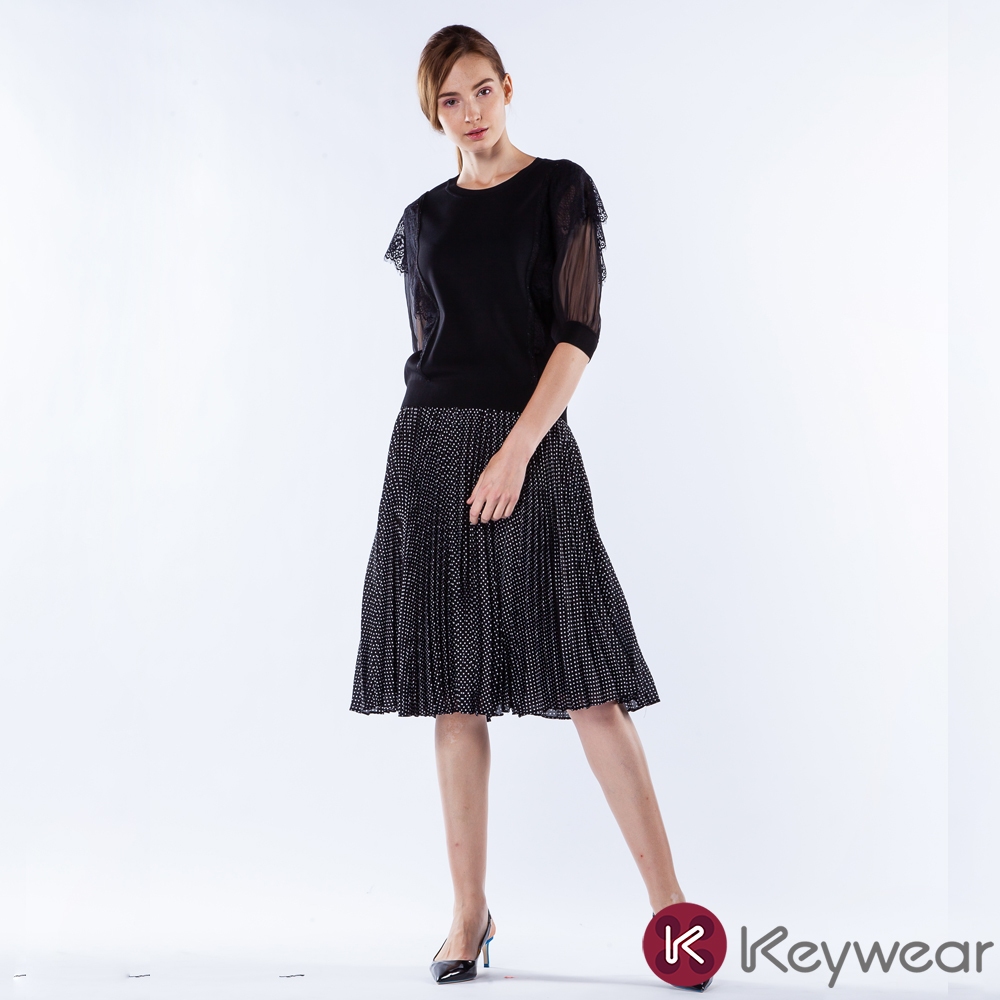 【KeyWear 奇威名品】百搭舒適波點百褶中長裙 黑色L|XL|MKeywear奇威官方旗艦店