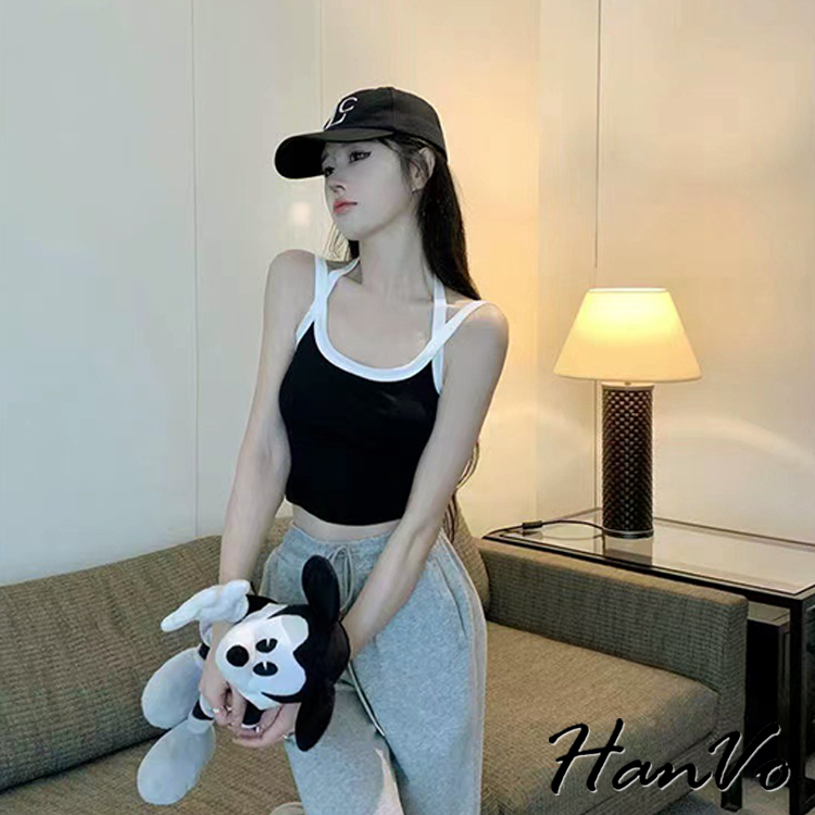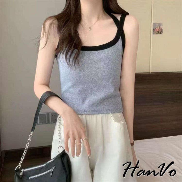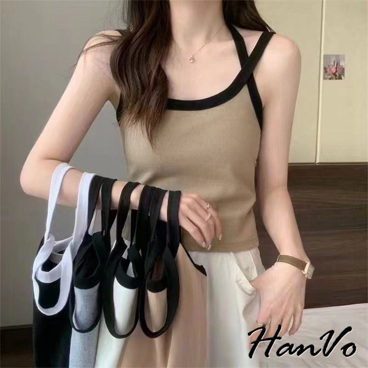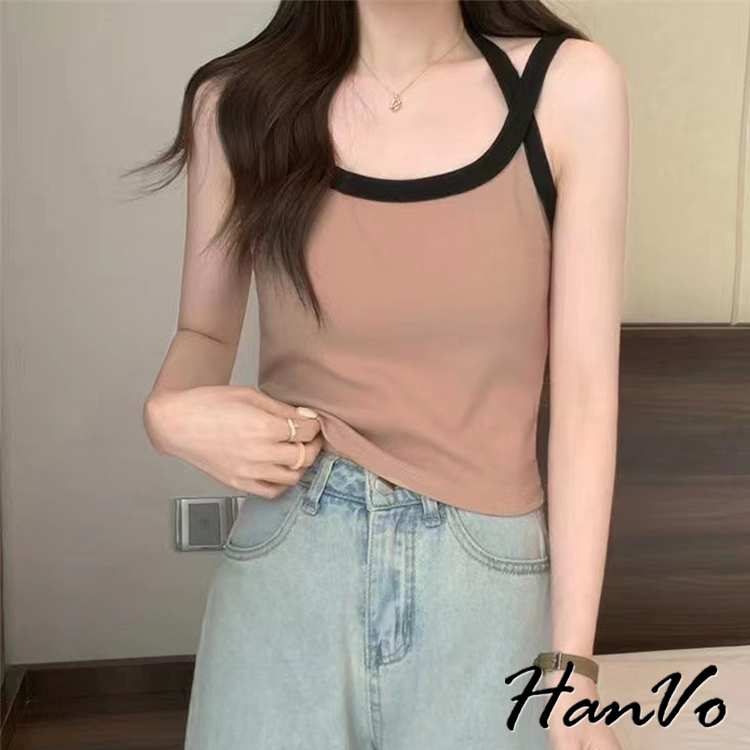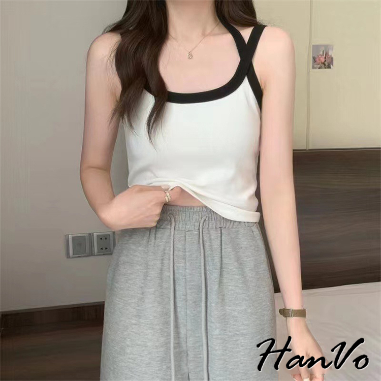 【HanVo】撞色滾邊螺紋肩帶交叉背心 親膚透氣彈性小可愛 附不可拆胸墊 居家內搭 女生衣著 A09-5063棕色|白色|卡其|灰色|黑色Tanks & CamisolesHanVo Wear Collection