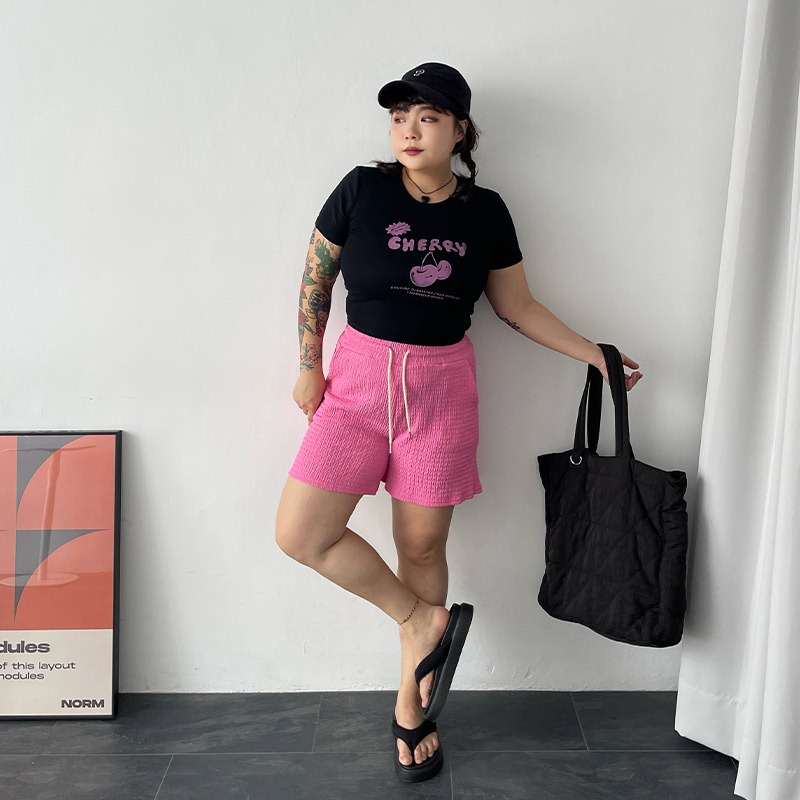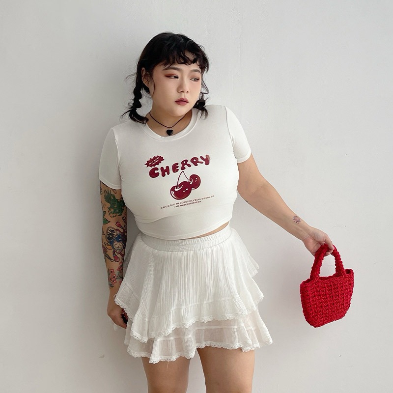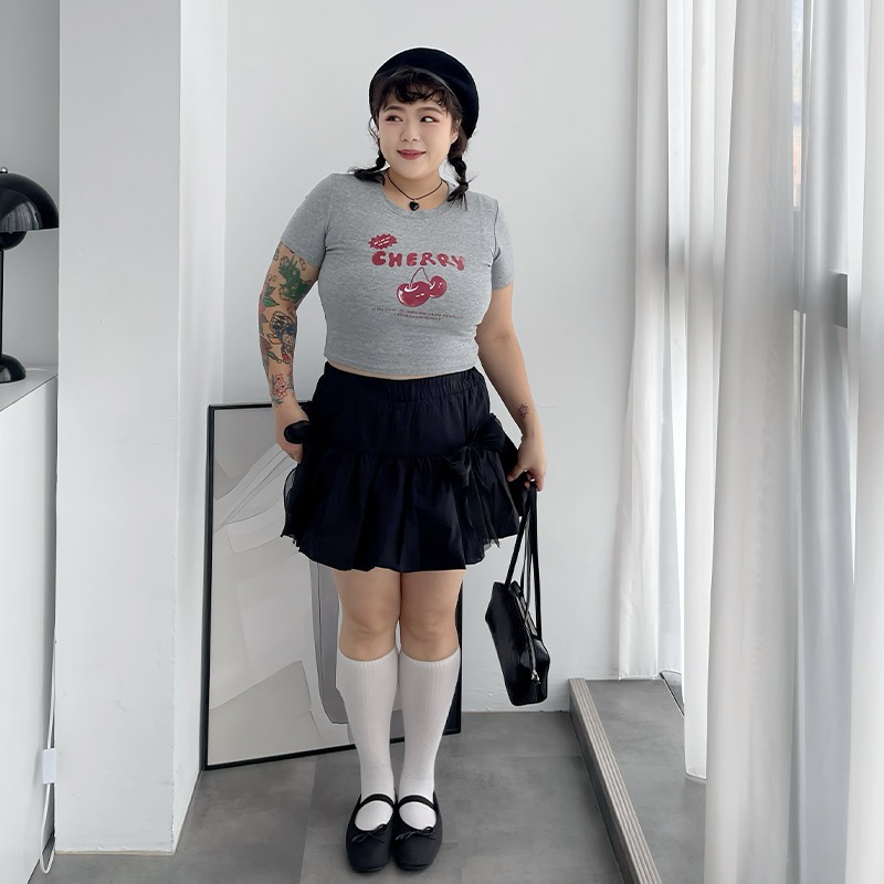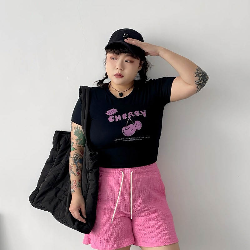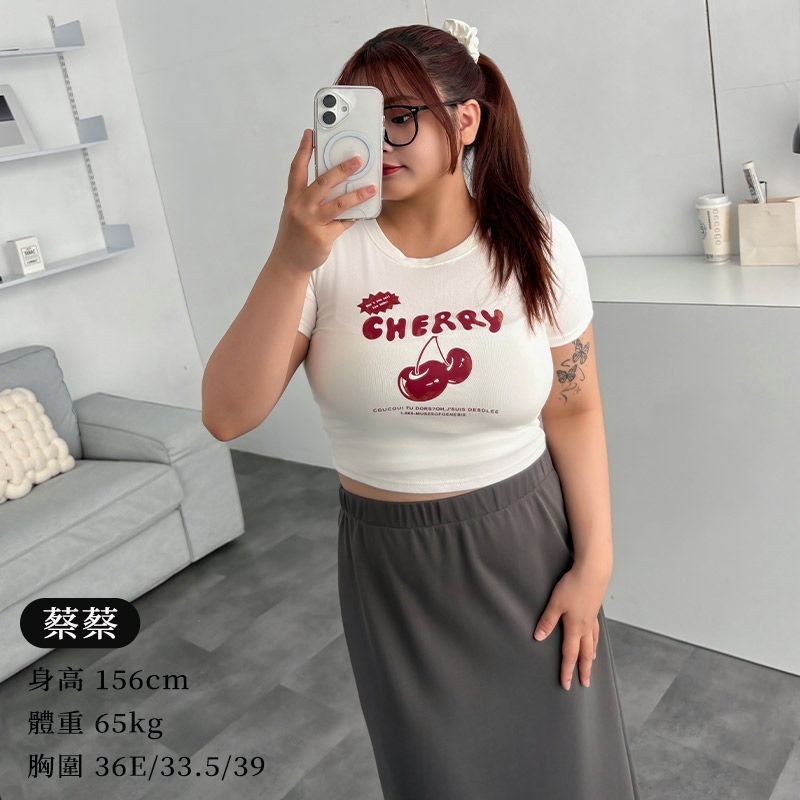 LULUS/PLUS/中大尺碼/櫻桃膠印修身上衣3色【A01250443】250625灰|黑|白T-shirtsLULUS