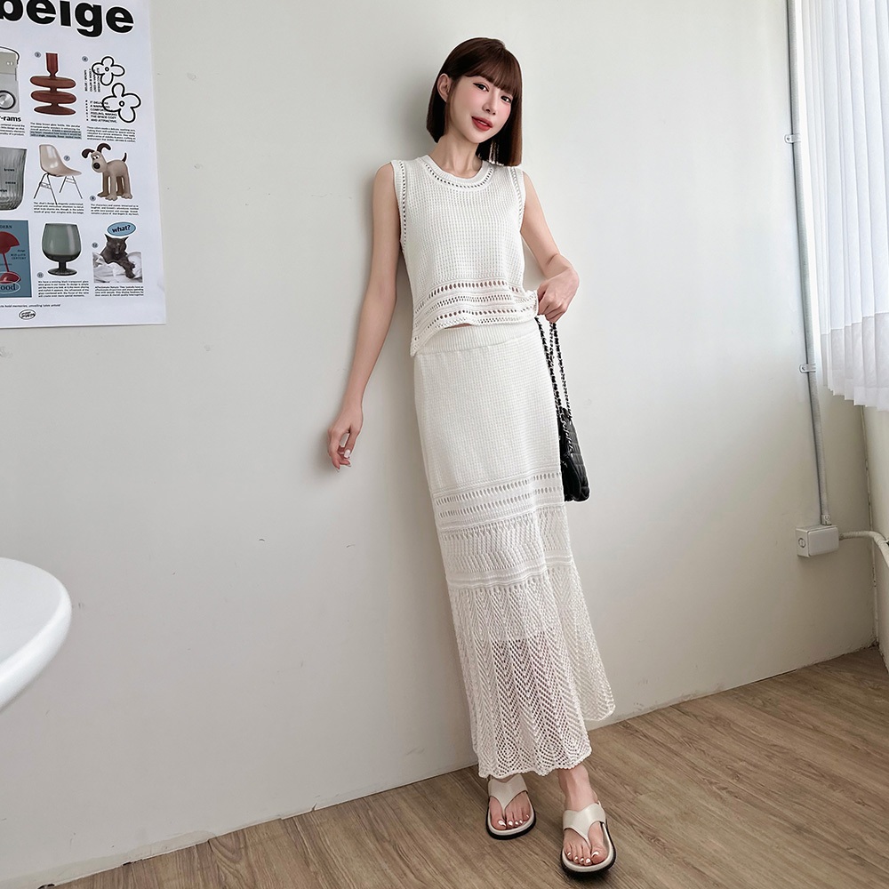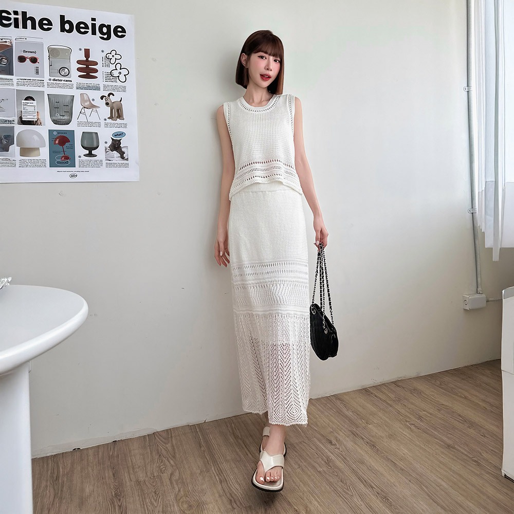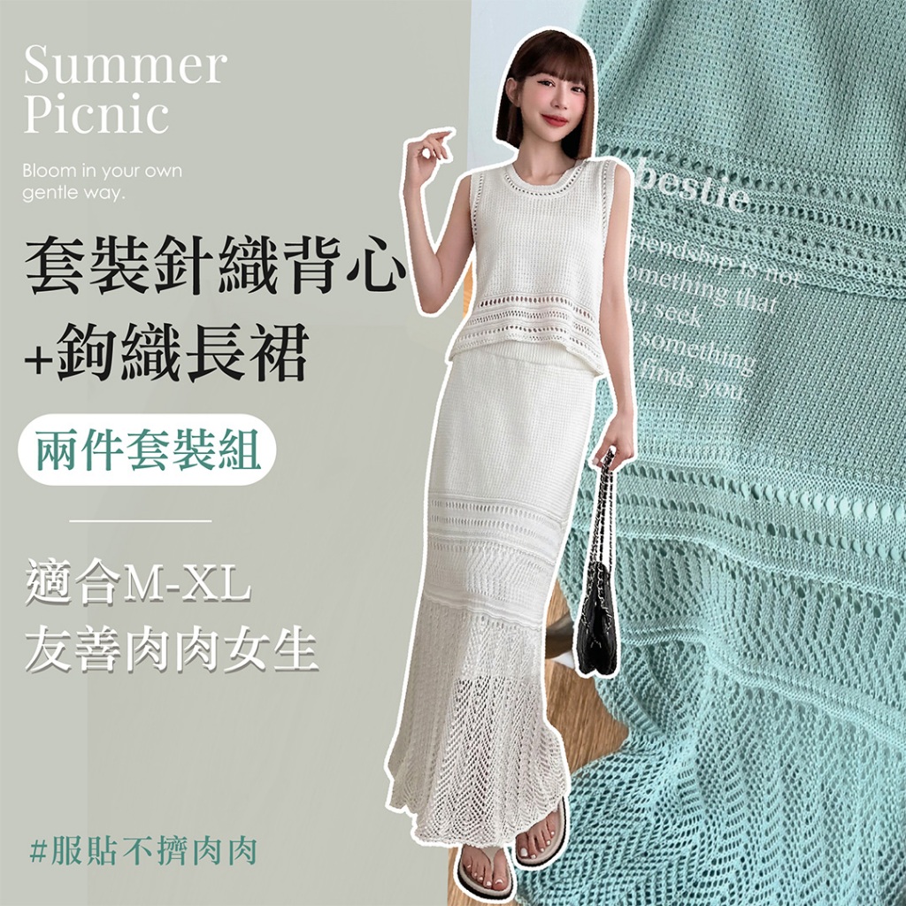 LULUS/套裝針織背心+鉤織長裙4色【A01250475】兩件式 渡假 裙子250625杏|黑|藍綠|白LULUS