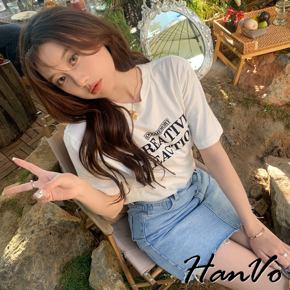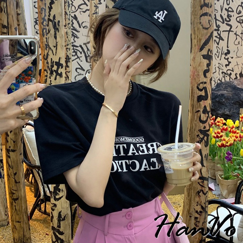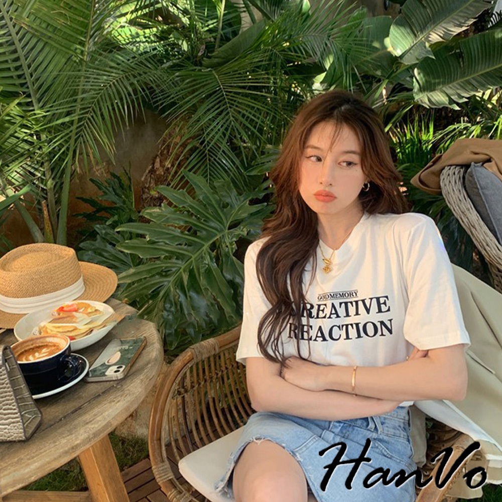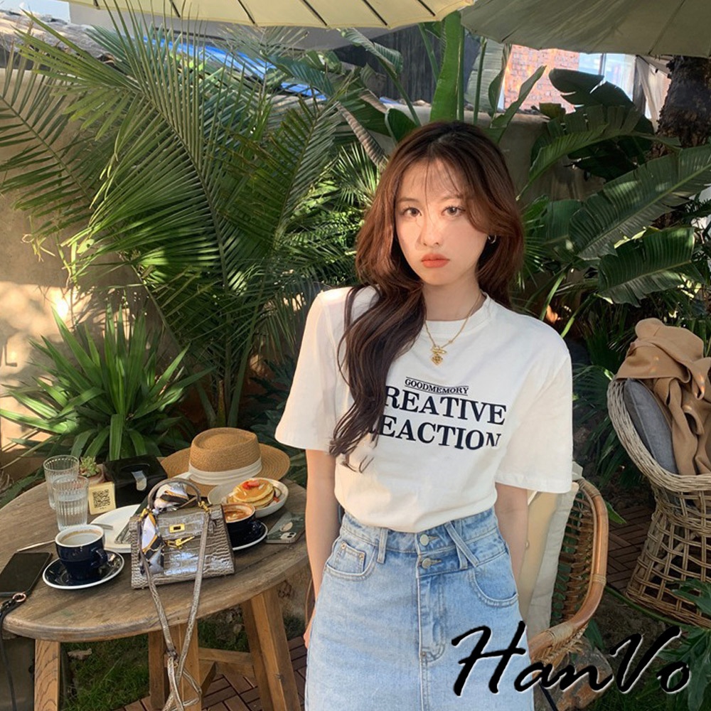 【HanVo】時尚英文字母圓領純棉上衣 透氣吸濕排汗 日常短袖上衣 韓系女裝 女生衣著 A01-0192黑色|白色T-shirtsHanVo Wear Collection