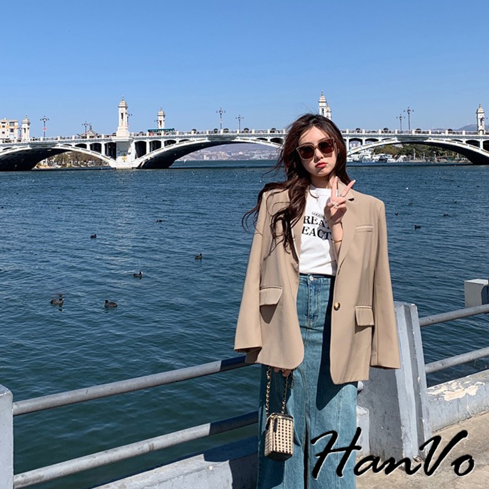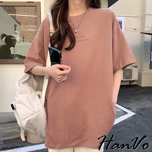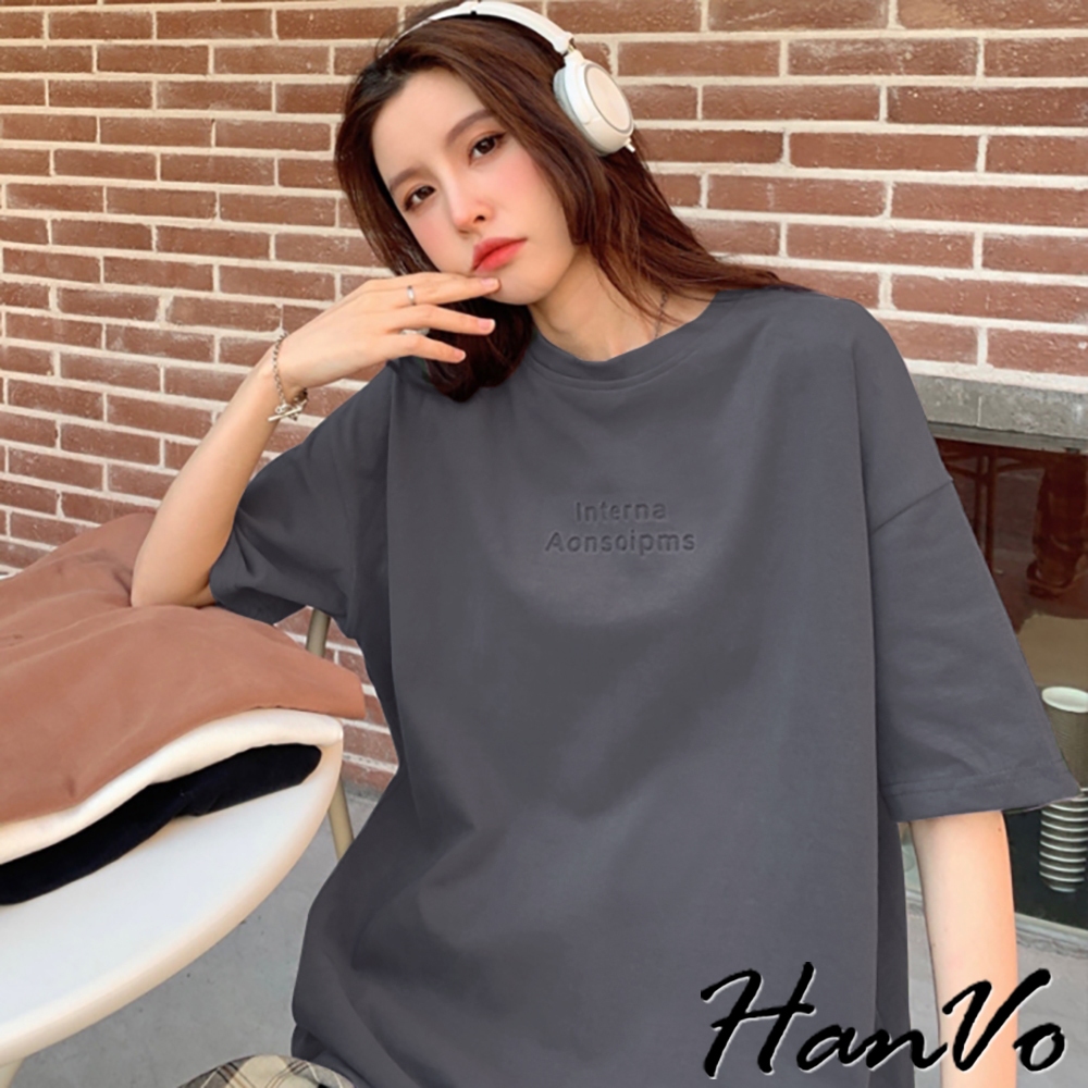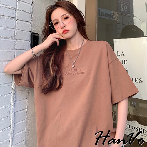 【HanVo】慵懶感落肩壓印字母T恤 韓版休閒百搭顯瘦圓領短袖上衣 韓國簡約時尚T恤 女生衣著 A01-1247黑色|白色|淺磚橘|霧灰T-shirtsHanVo Wear Collection