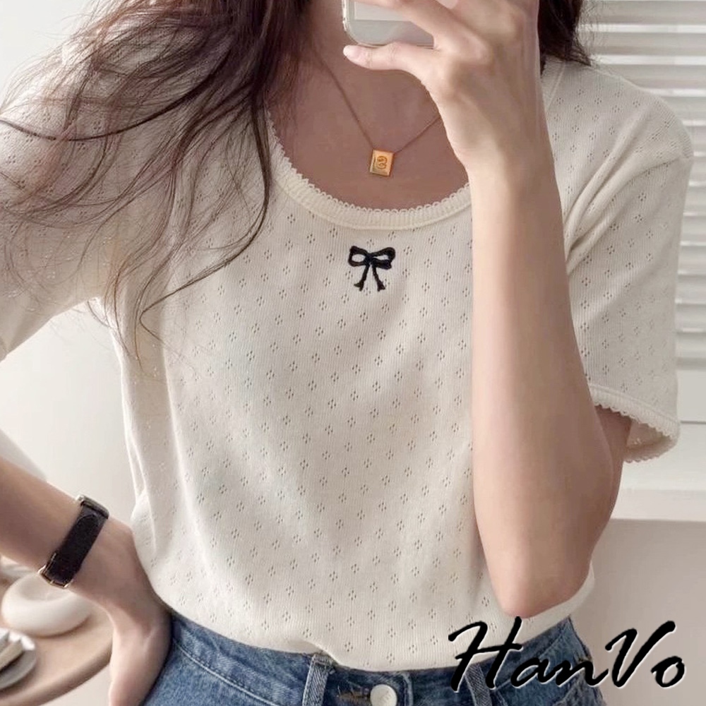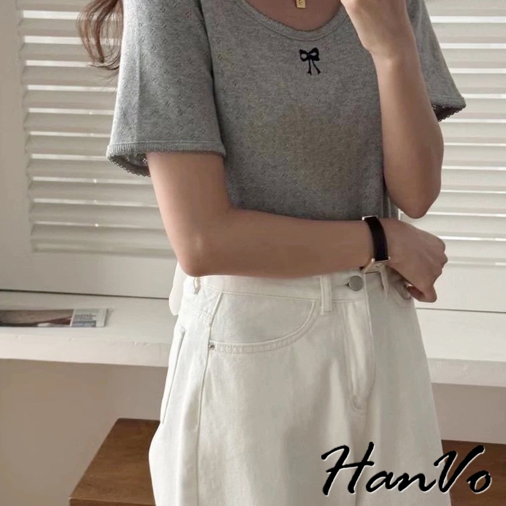 【HanVo】蝴蝶結刺繡鏤空圓領衣 甜美氣質流行設計感 韓系女裝 女生衣著 A01-0304灰色|黑色|白色T-shirtsHanVo Wear Collection