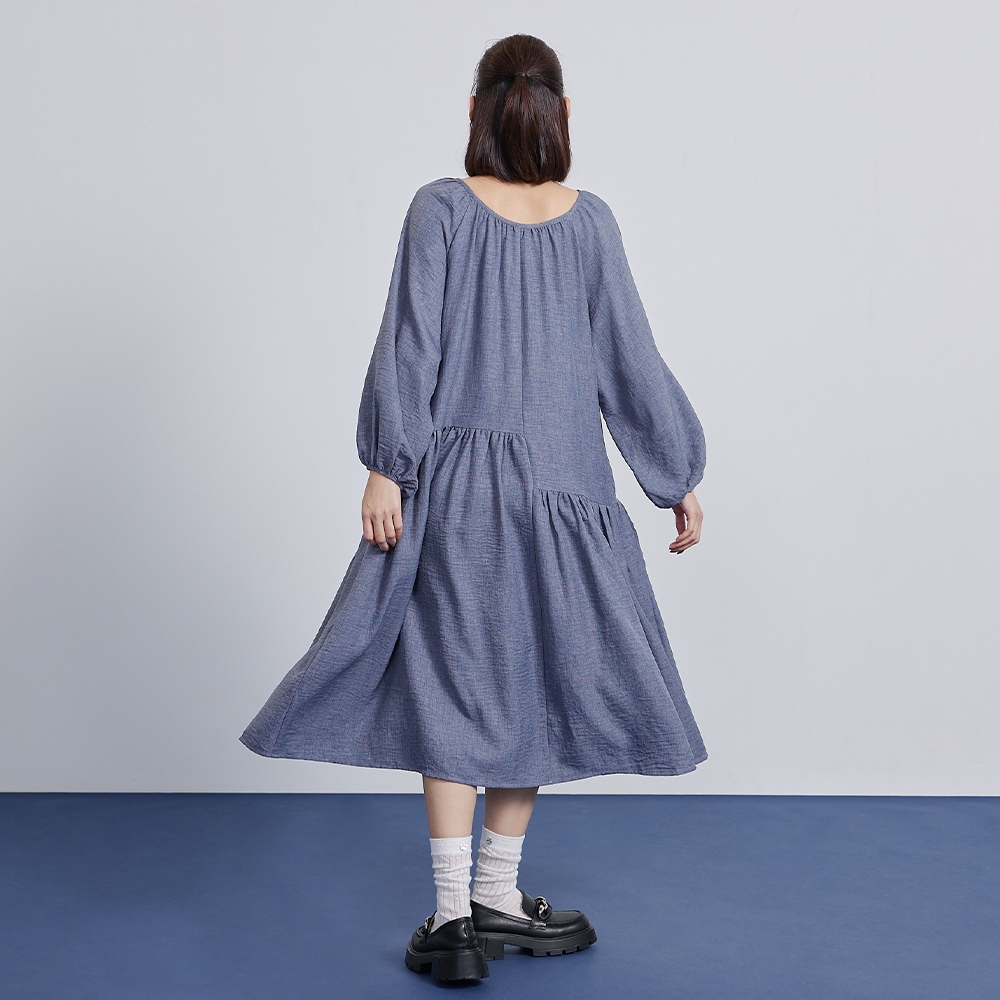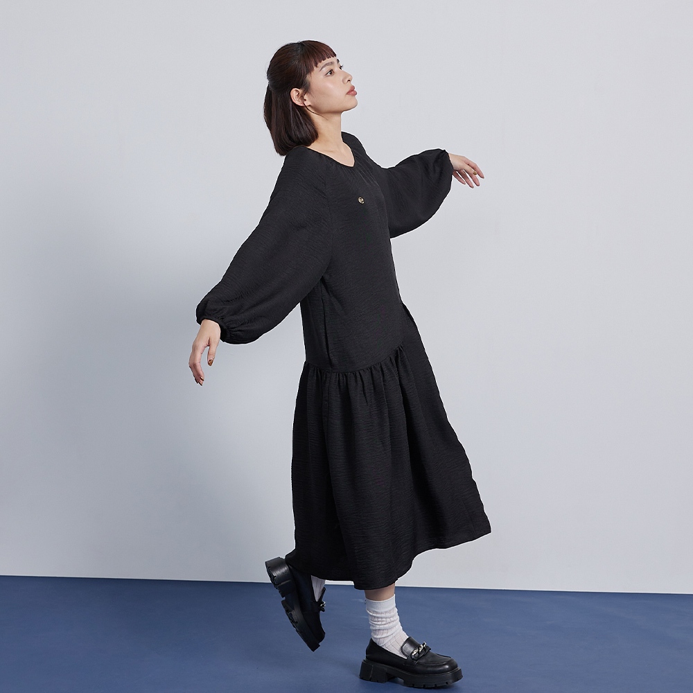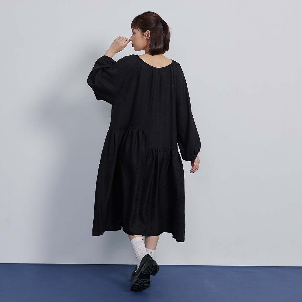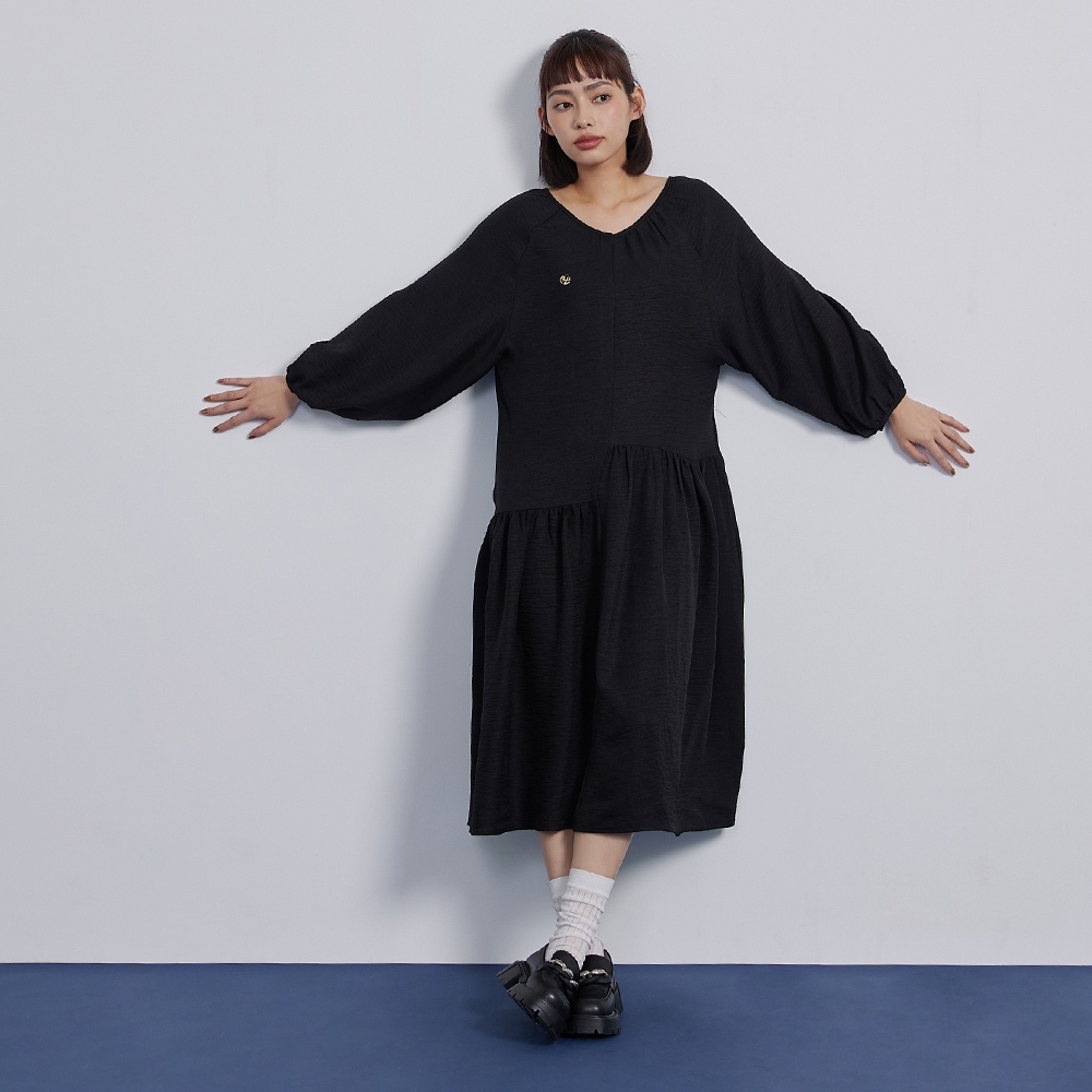【gozo】➤不對稱拼接V領百褶洋裝(黑色/藍色_F) | 女裝 V領 百搭 洋裝 長袖洋裝 顯瘦洋裝 日系洋裝