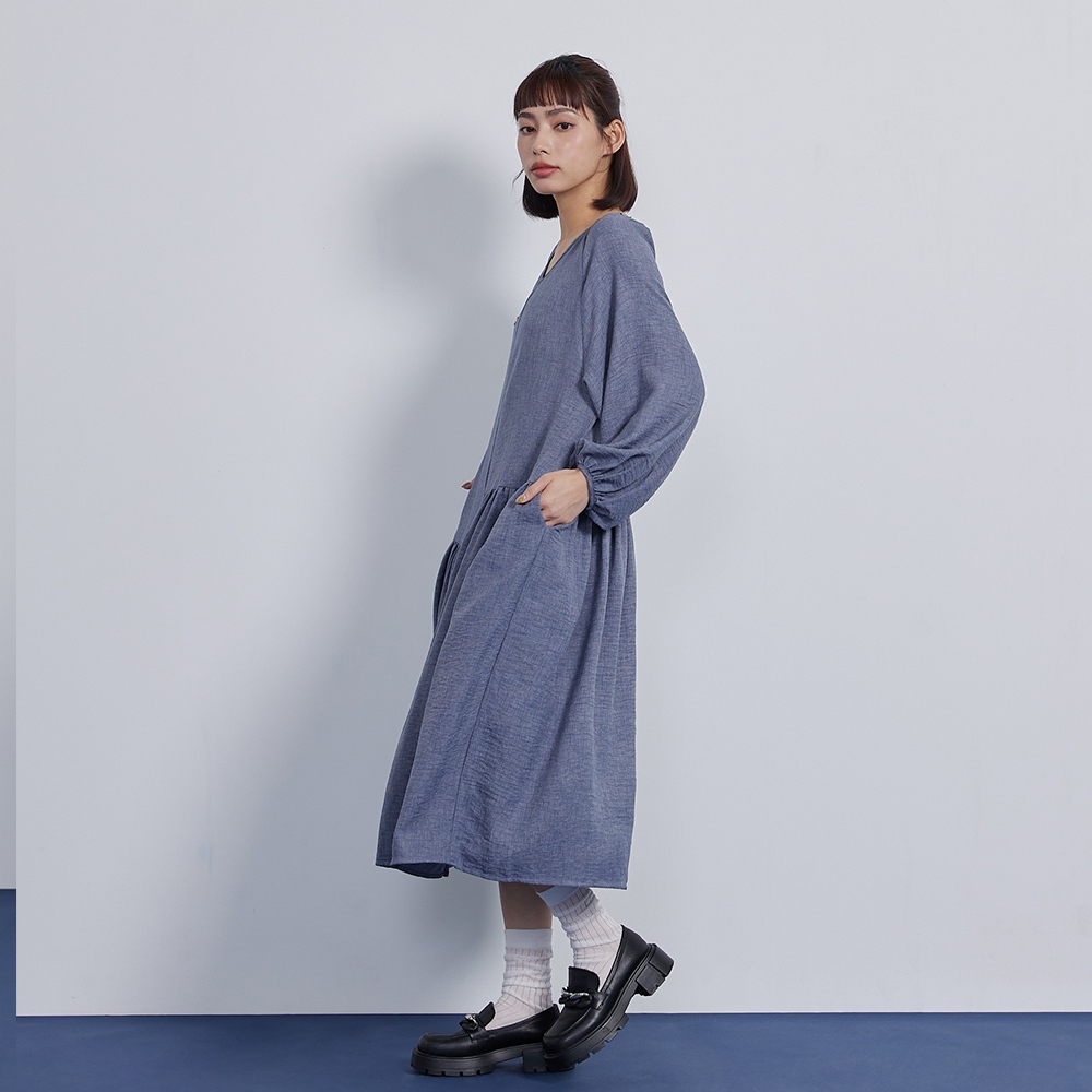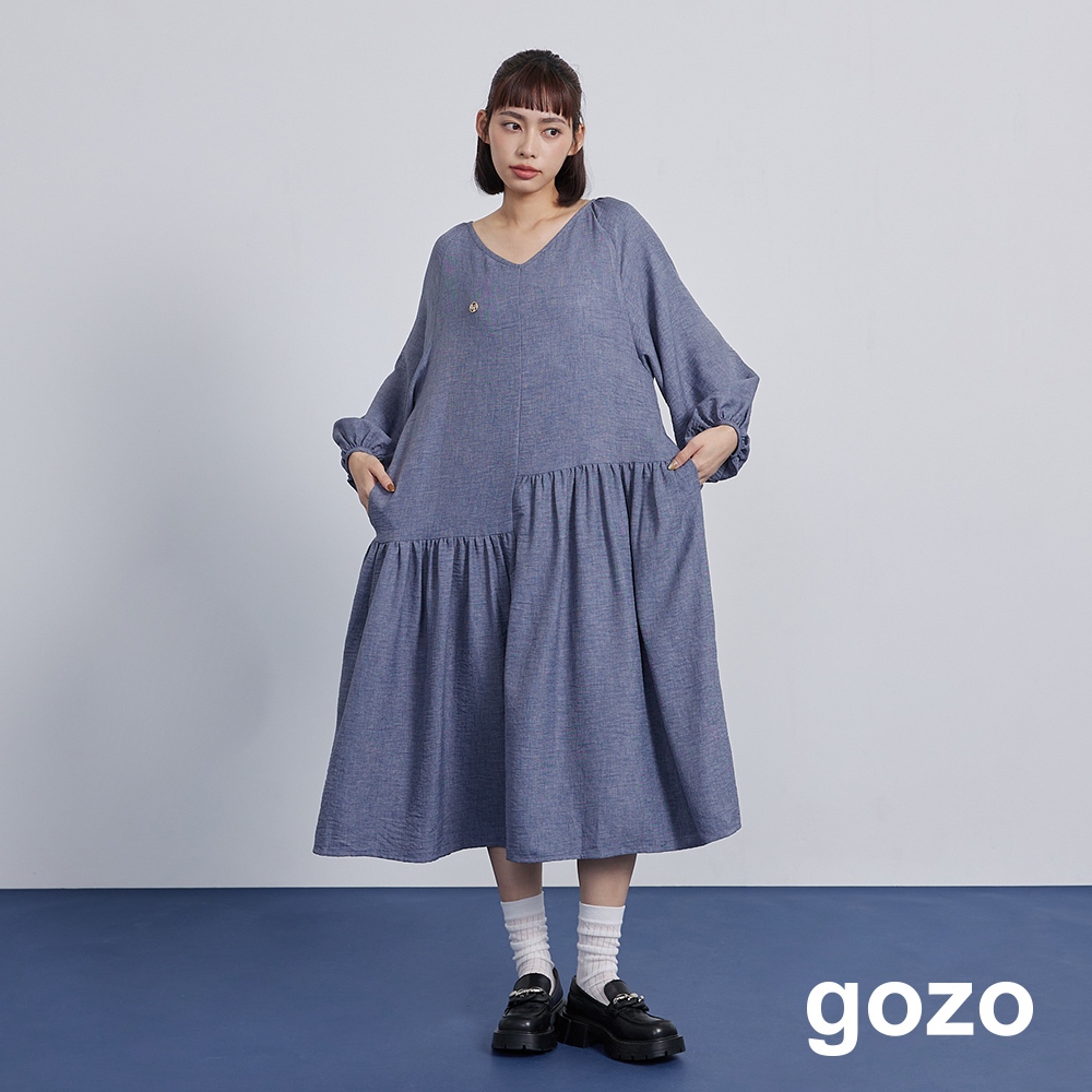 【gozo】➤不對稱拼接V領百褶洋裝(黑色/藍色_F) | 女裝 V領 百搭 洋裝 長袖洋裝 顯瘦洋裝 日系洋裝黑色,F|藍色,Fgozo 品牌旗艦店