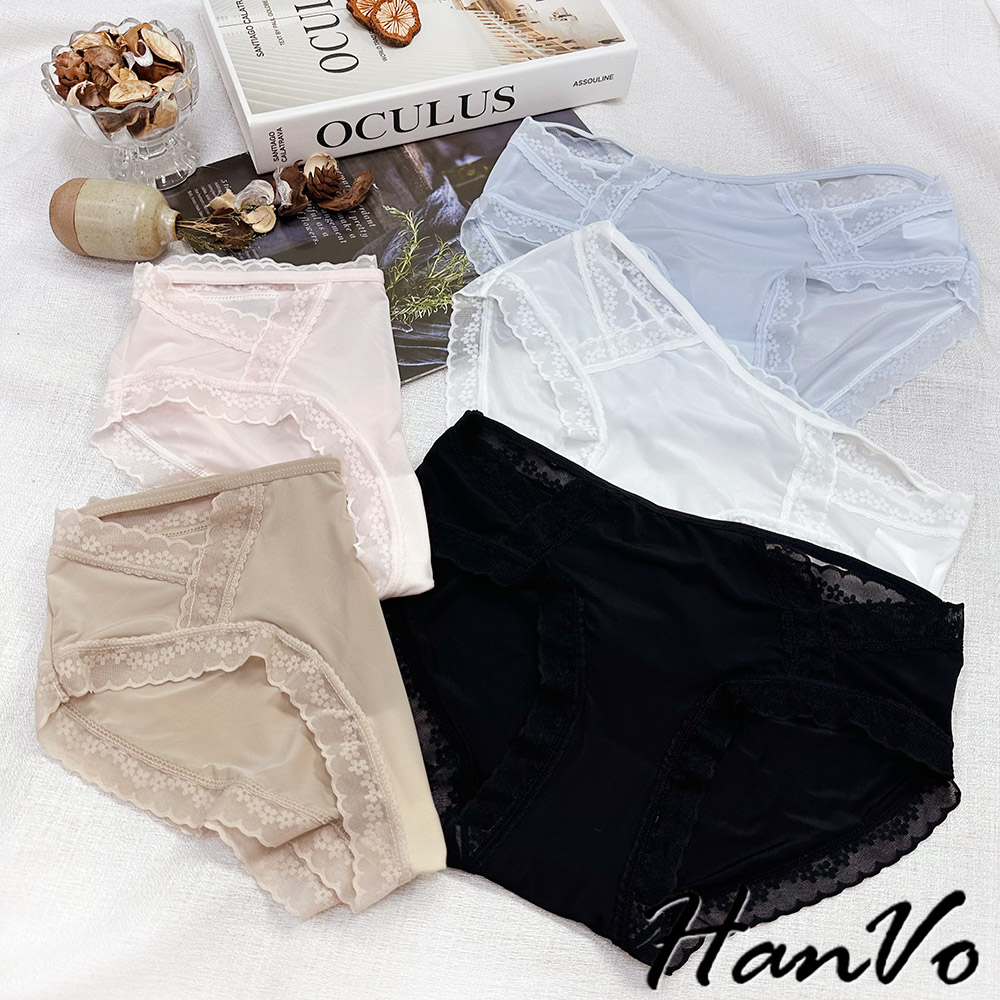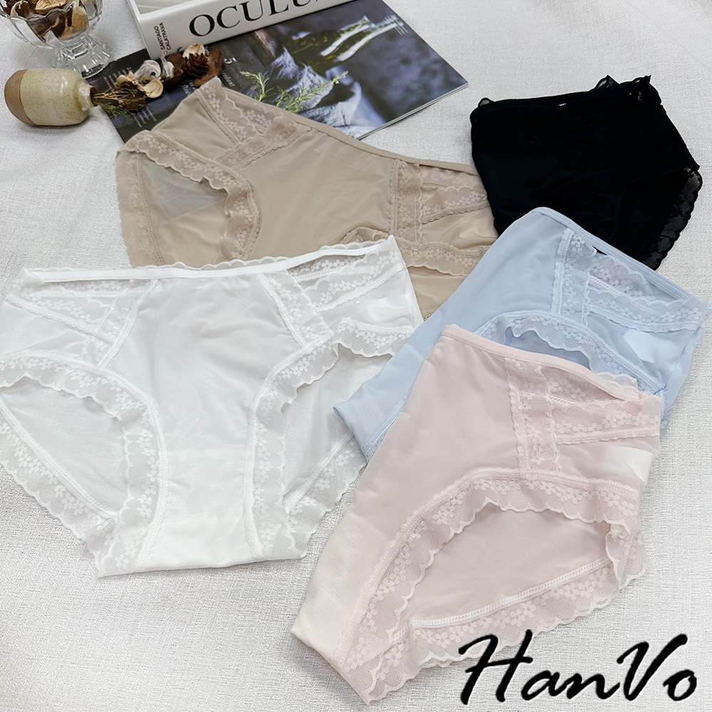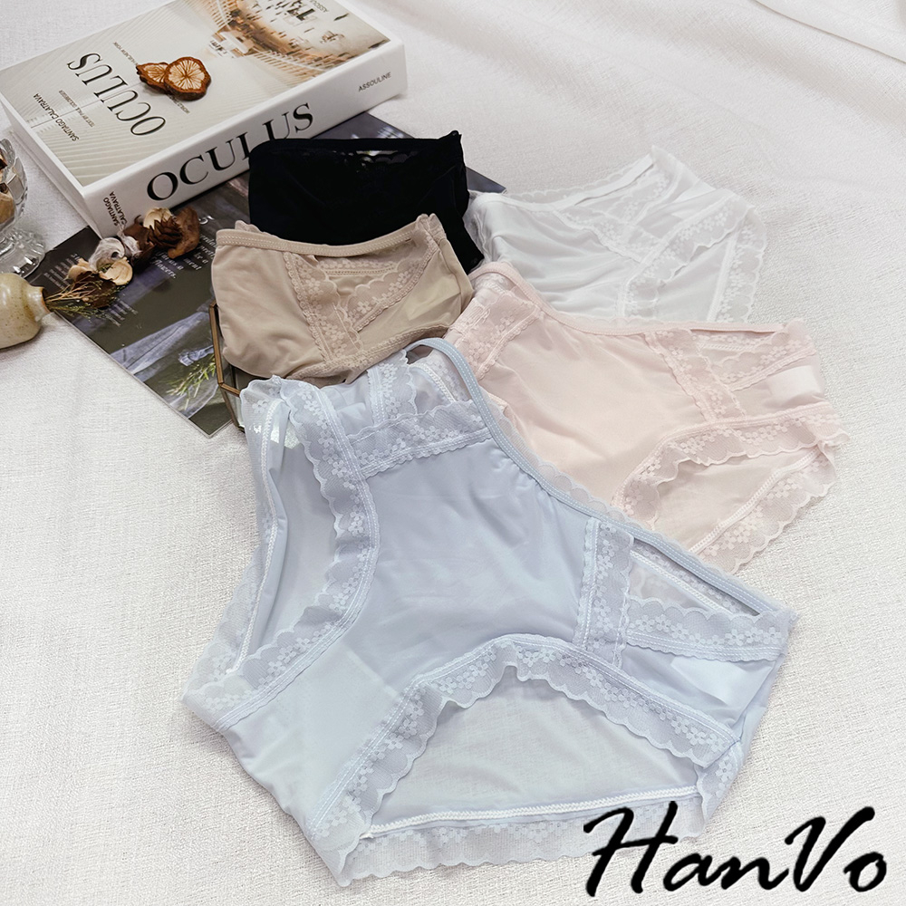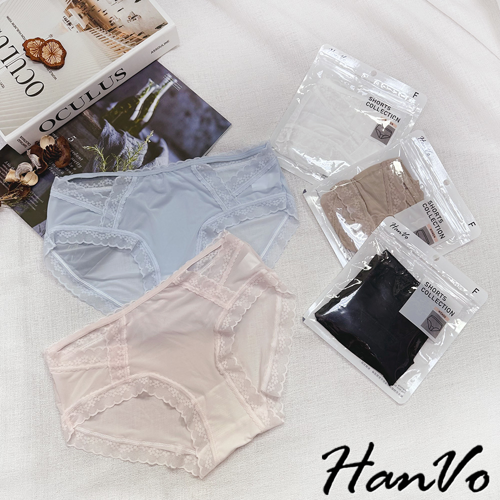 【HanVo】典雅小花蕾絲鏤空冰絲內褲 獨立包裝 透氣輕薄涼感中腰三角褲 女生內褲 女內褲 內褲 A11-5758月夜黑|蜜茶咖|仙女白|天空藍|花瓣粉PantiesHanVo Wear Collection