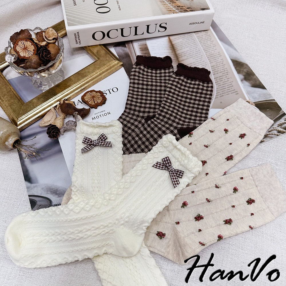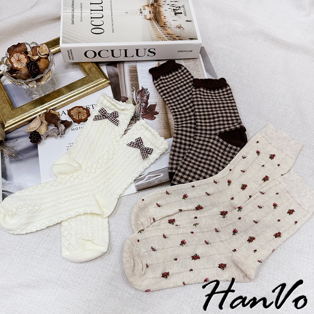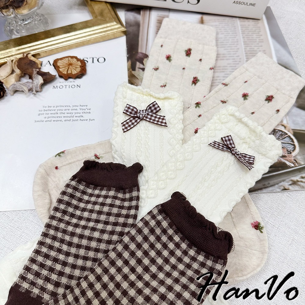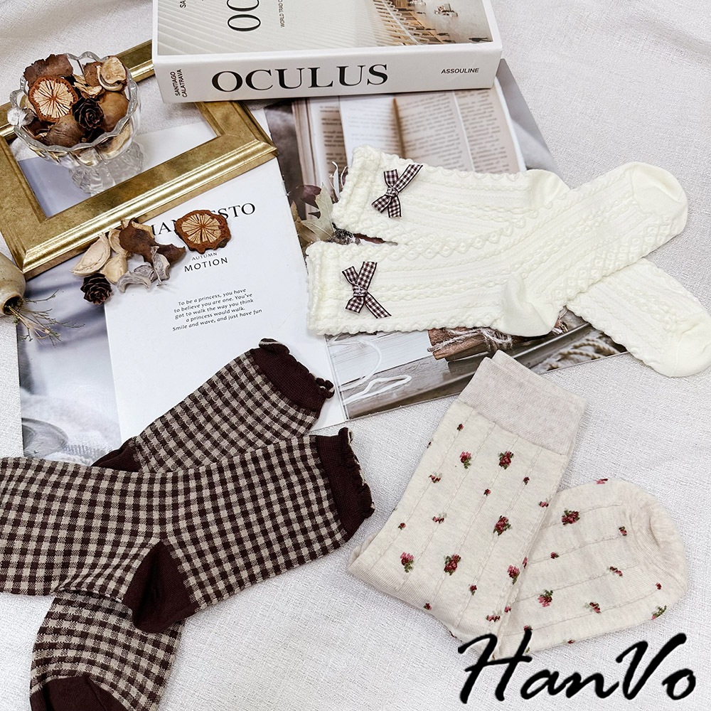 【HanVo】森林系立體織紋蝴蝶結襪 韓系舒適流行百搭棉質襪 韓國時尚休閒襪 女生配件 A12-6291立體蝴蝶結|小碎花|咖色格子SocksHanVo Wear Collection