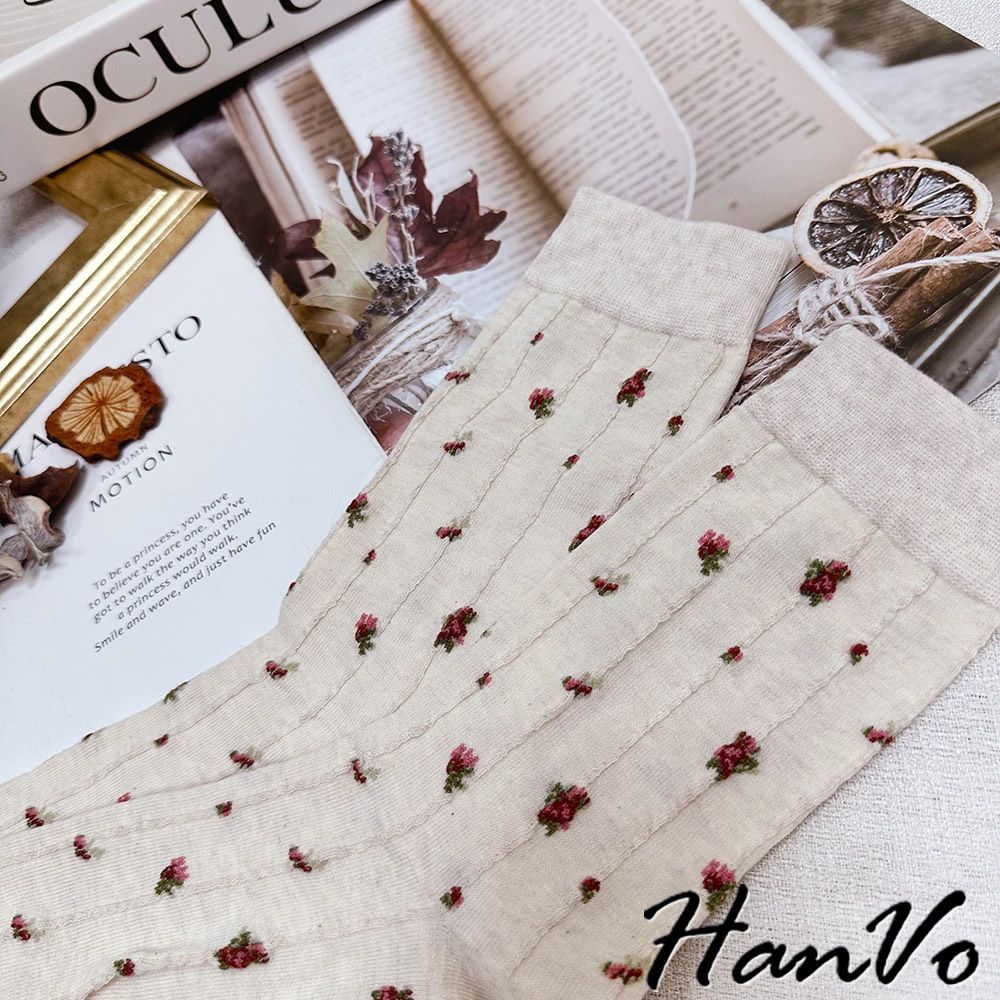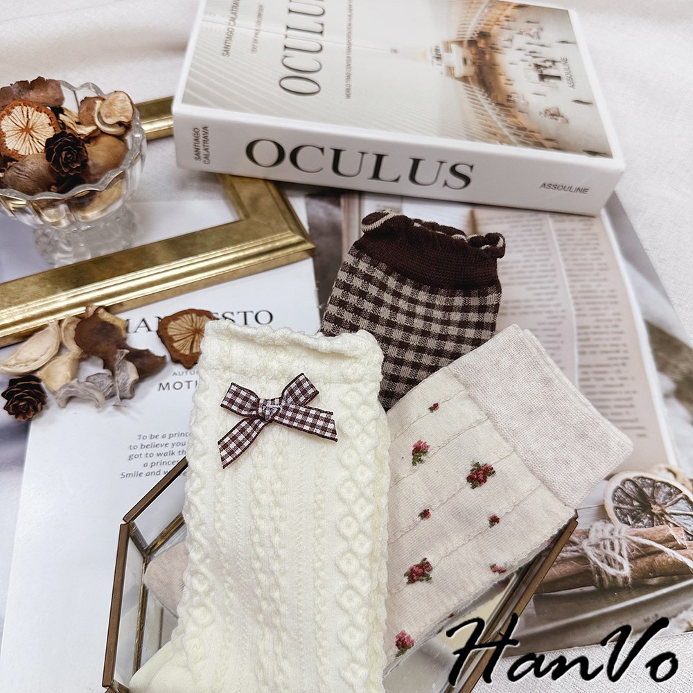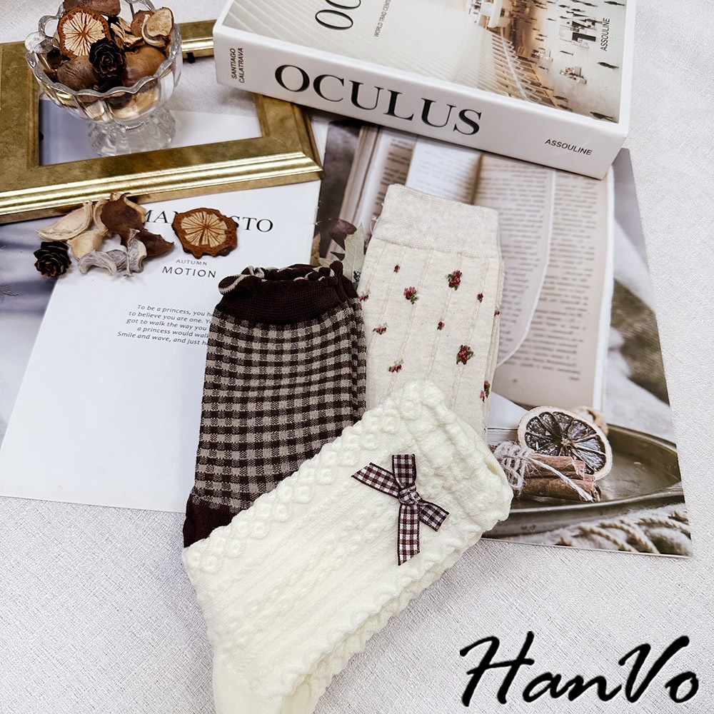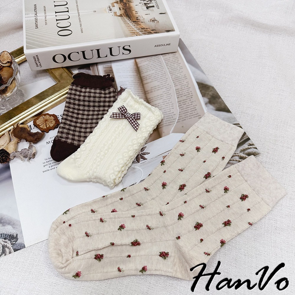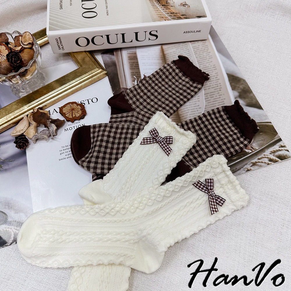【HanVo】森林系立體織紋蝴蝶結襪 韓系舒適流行百搭棉質襪 韓國時尚休閒襪 女生配件 A12-6291立體蝴蝶結|小碎花|咖色格子SocksHanVo Wear Collection