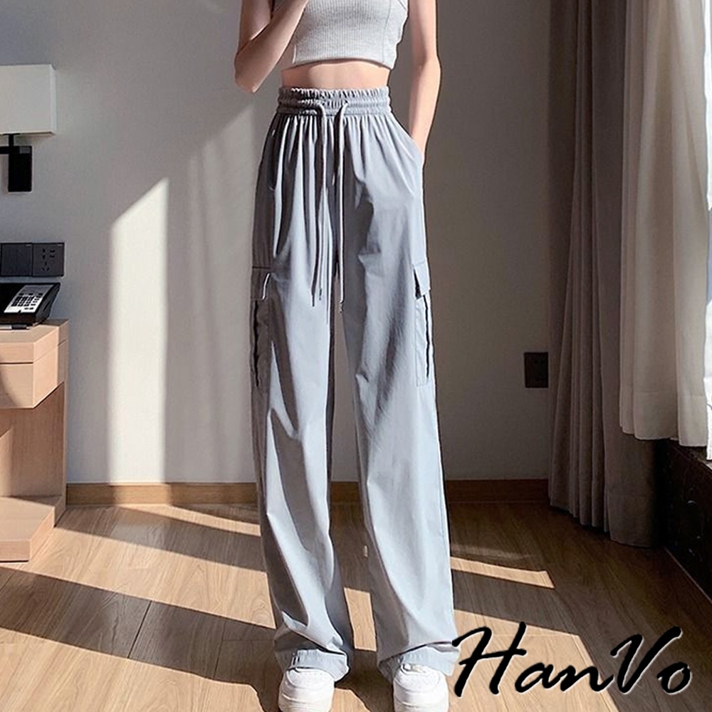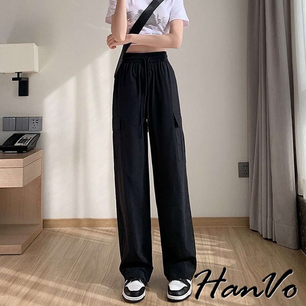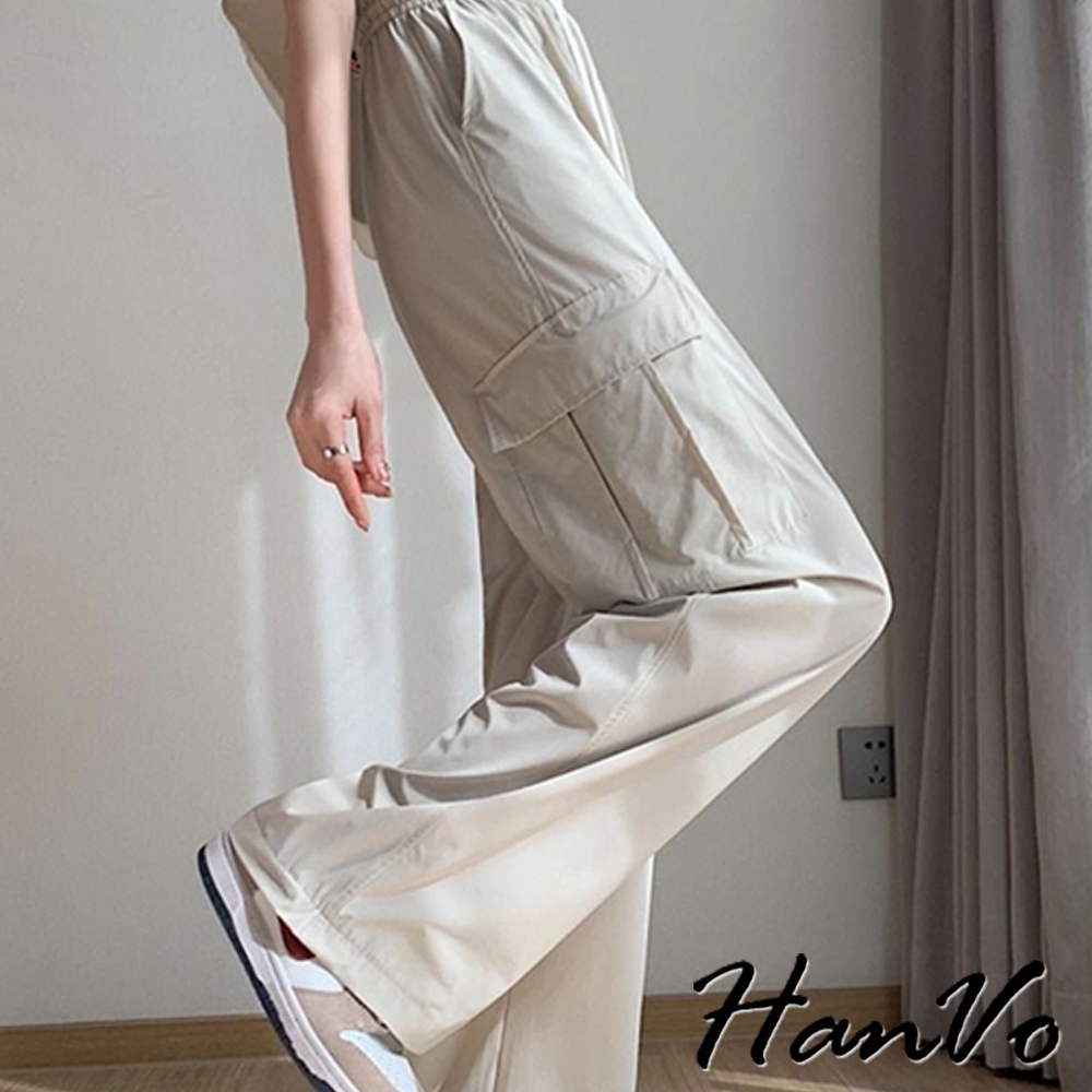 【HanVo】側邊大口袋輕薄抽繩工裝褲 涼感紗速乾休閒直筒 闊腿褲 韓系休閒褲 修飾 女生長褲 A04-2625黑色,S|黑色,M|黑色,L|黑色,XL|灰色,S|灰色,M|灰色,L|灰色,XL|杏色,S|杏色,M|杏色,L|杏色,XLPantsHanVo Wear Collection