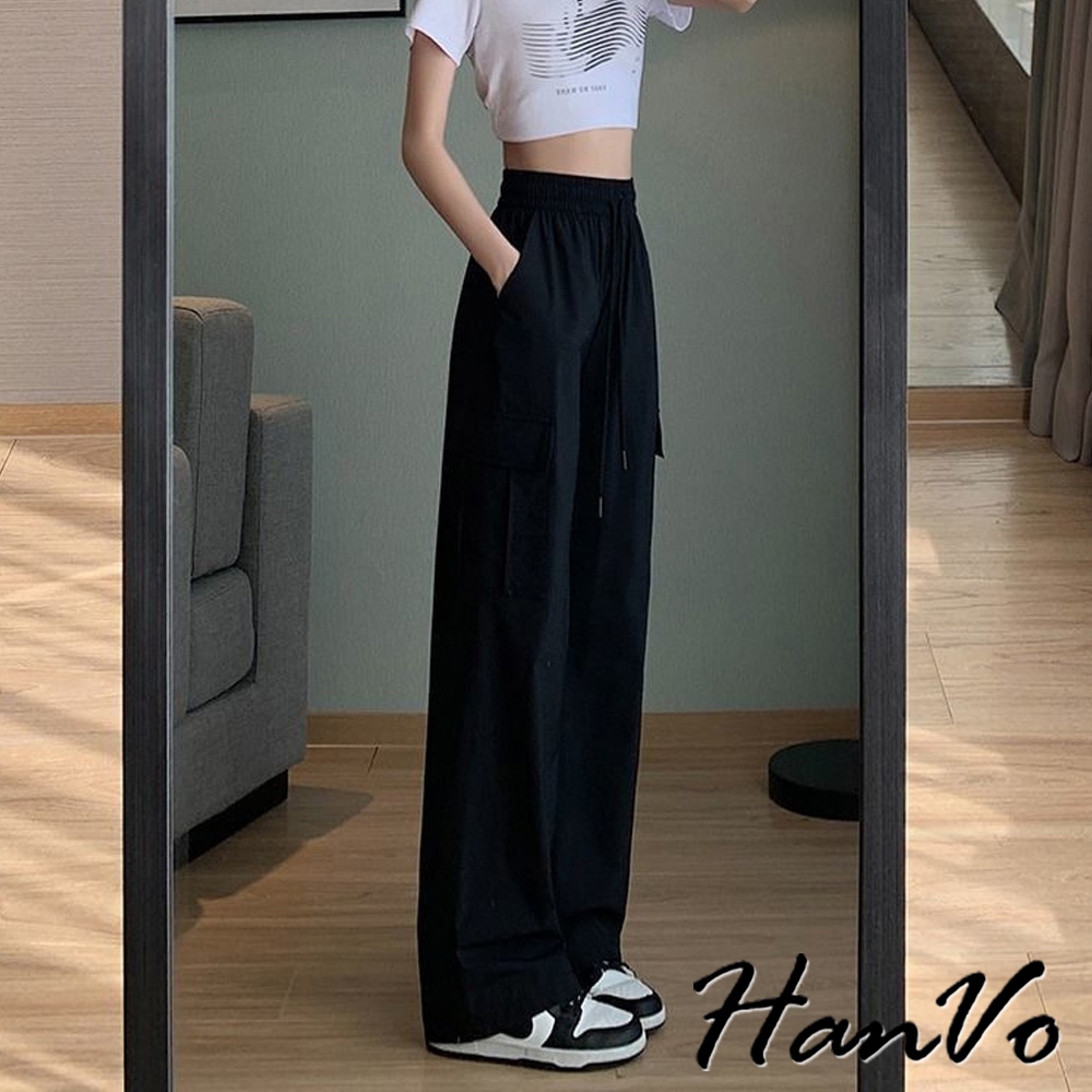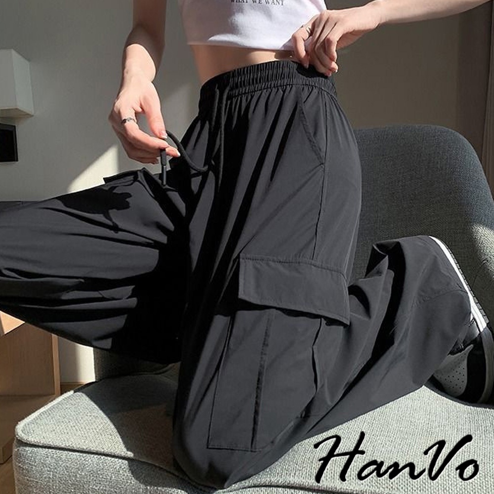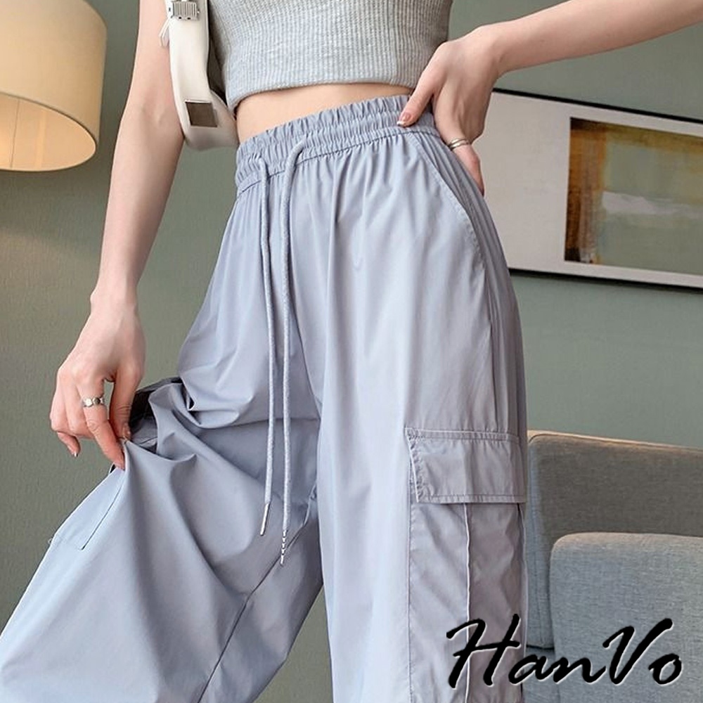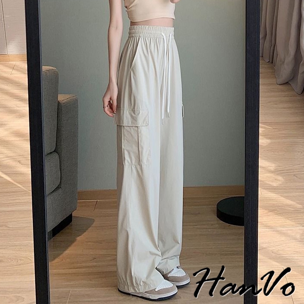 【HanVo】側邊大口袋輕薄抽繩工裝褲 涼感紗速乾休閒直筒 闊腿褲 韓系休閒褲 修飾 女生長褲 A04-2625黑色,S|黑色,M|黑色,L|黑色,XL|灰色,S|灰色,M|灰色,L|灰色,XL|杏色,S|杏色,M|杏色,L|杏色,XLPantsHanVo Wear Collection