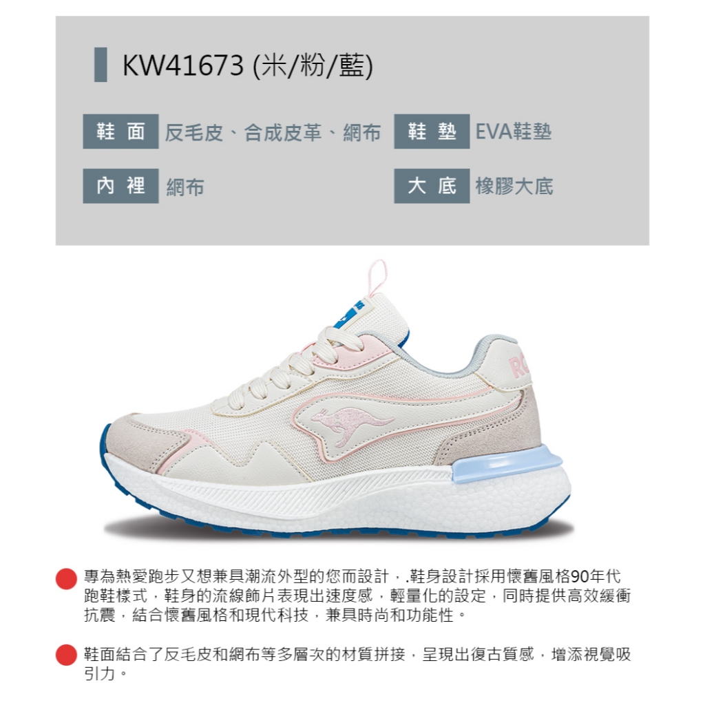 【KangaROOS 美國袋鼠鞋】女鞋 LEGACY 美式復古跑鞋 跑步健行 輕量抗震 (米/粉/藍-KW41673)23cm|23.5cm|24cm|24.5cm|25cm|25.5cmKangaROOS 美國袋鼠鞋 官方旗艦店