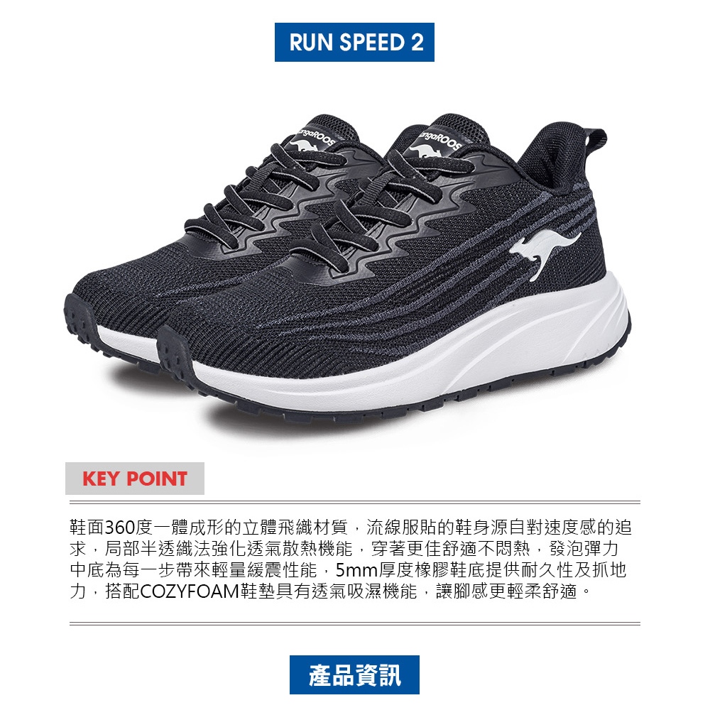 【KangaROOS 美國袋鼠鞋】女鞋 RUN SPEED 2 透氣吸濕 涼爽散熱 輕量緩震 (黑-KW41550)23cm|23.5cm|24cm|24.5cm|25cm|25.5cmKangaROOS 美國袋鼠鞋 官方旗艦店