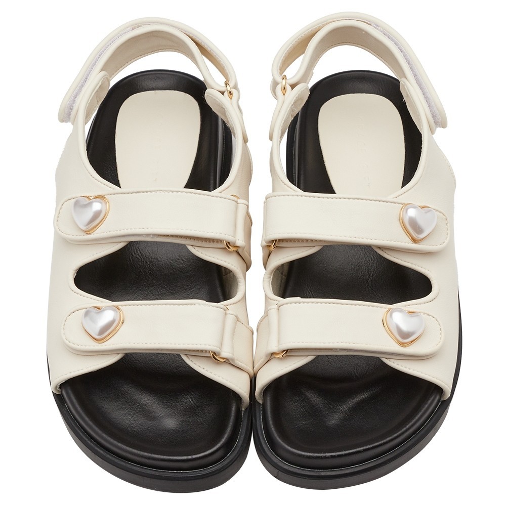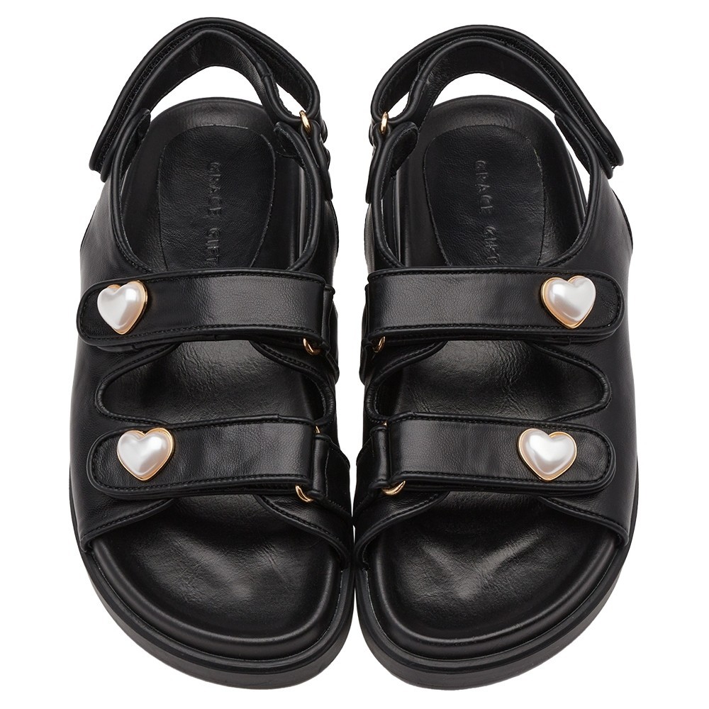 • 【Grace Gift】】涼鞋 平底涼鞋【珍珠愛心雙帶魔鬼氈涼鞋】5色 35-43號 大尺碼 涼鞋女