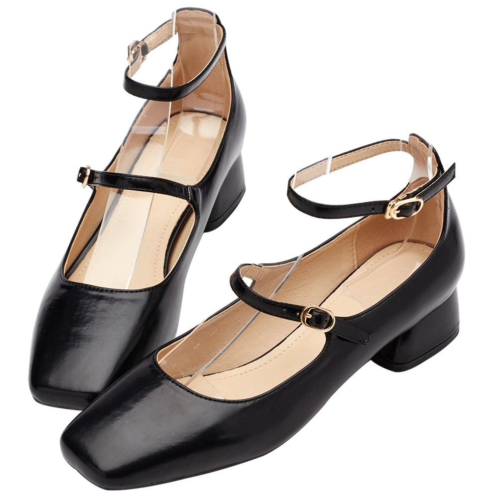 【Grace Gift】瑪莉珍鞋 包鞋 瑪麗珍【復古方頭雙帶中跟芭蕾瑪莉珍鞋】4色 35-42號 大尺碼 瑪莉珍