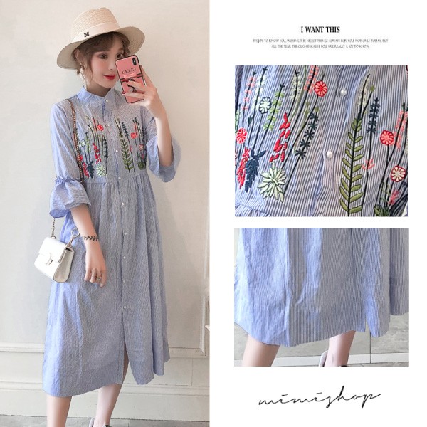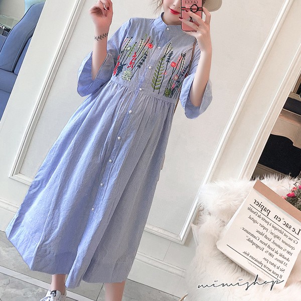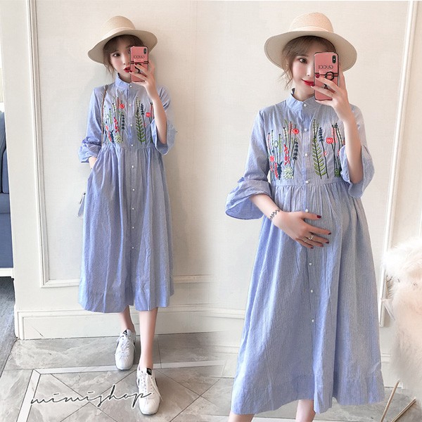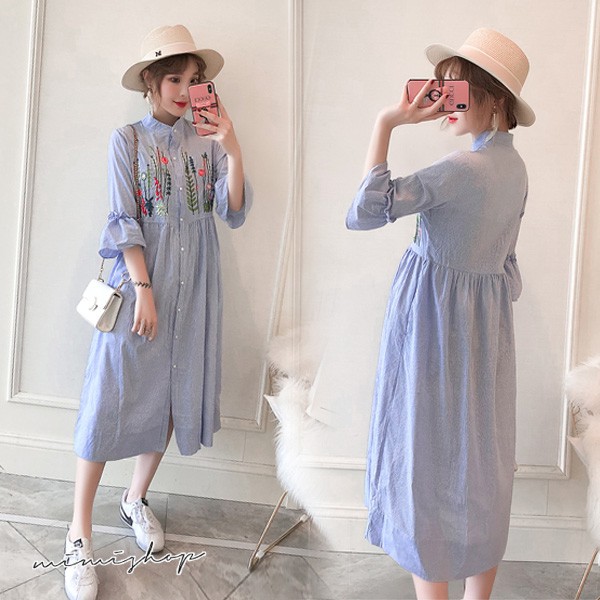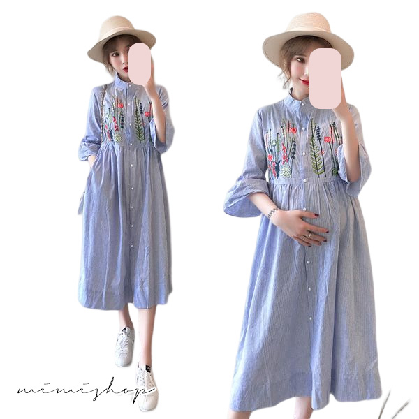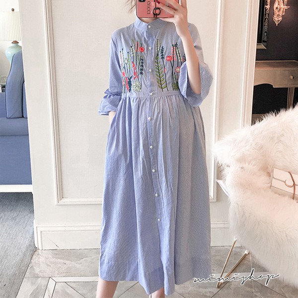 MIMI別走孕婦裝 擁抱花兒 質感刺繡襯衫連身裙 孕婦洋裝 長裙【P521048】藍Maternity DressesMIMI別走孕婦裝哺乳衣
