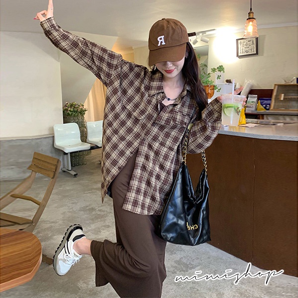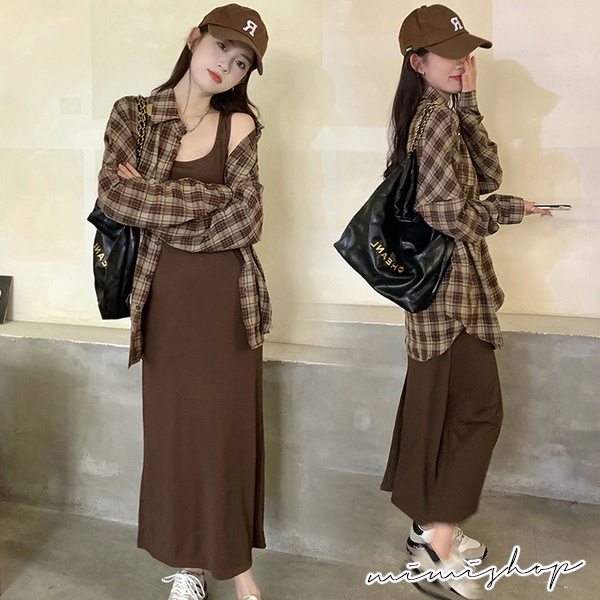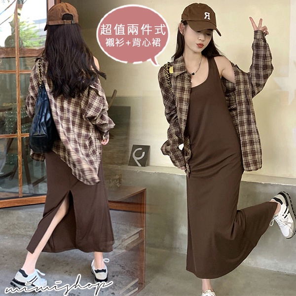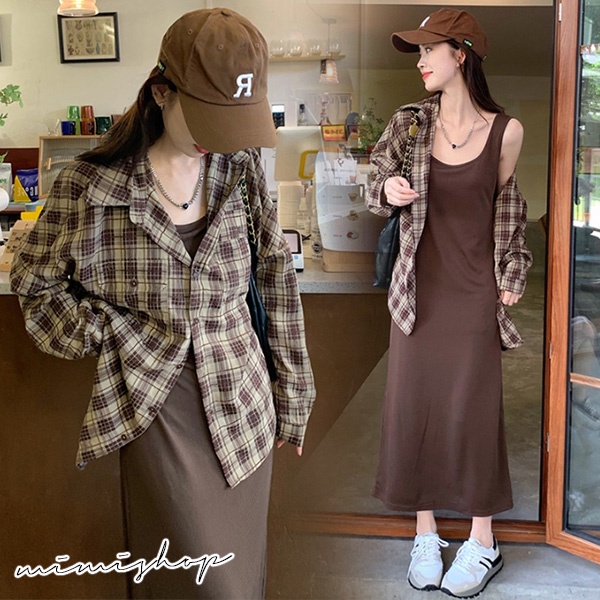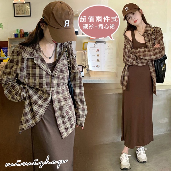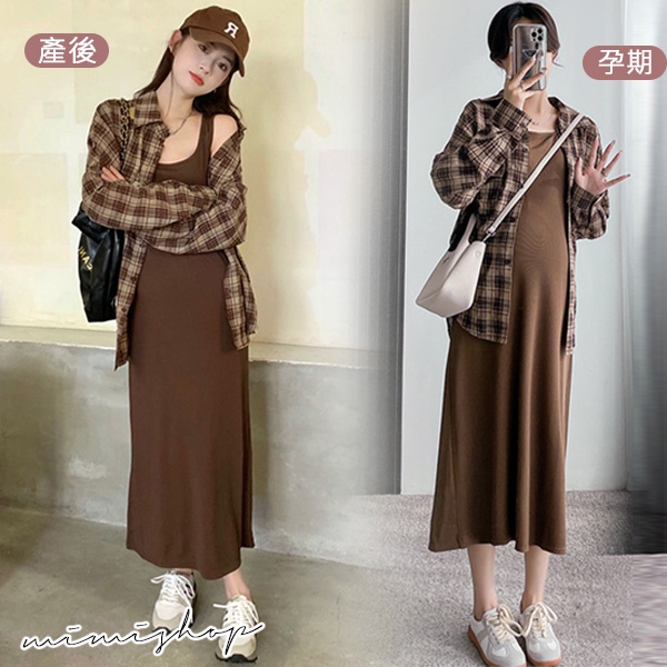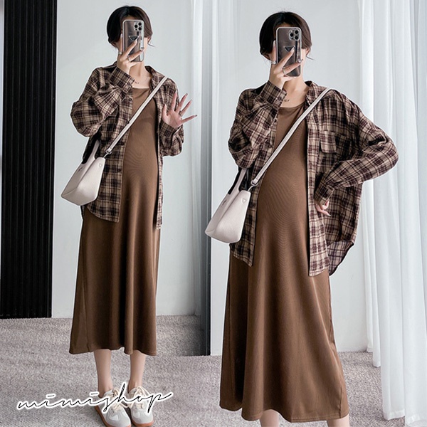 MIMI別走孕婦裝 輕鬆出遊 兩件式 長袖格子襯衫+背心裙 孕婦套裝【P31530】咖格襯衫+背心裙Maternity SetsMIMI別走孕婦裝哺乳衣