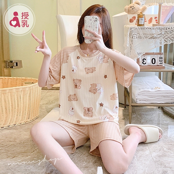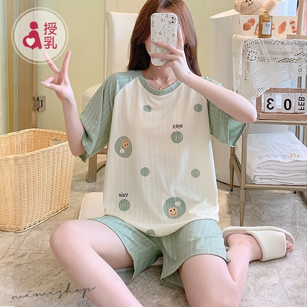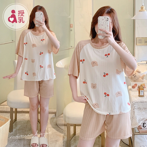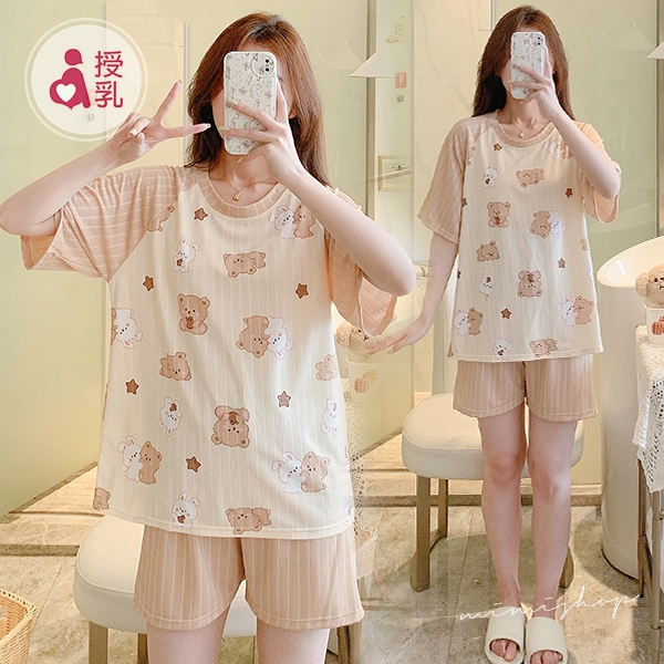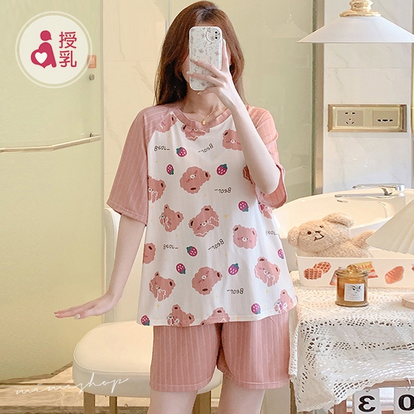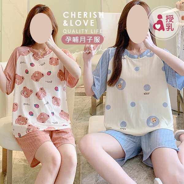 MIMI別走孕婦裝 遇見美好 針織紋透氣哺乳衣+短褲 哺乳睡衣 居家坐月子【P21373】抱抱熊兔|櫻桃小熊|笑臉藍袖|草莓熊熊|笑臉綠袖Breastfeeding WearMIMI別走孕婦裝哺乳衣