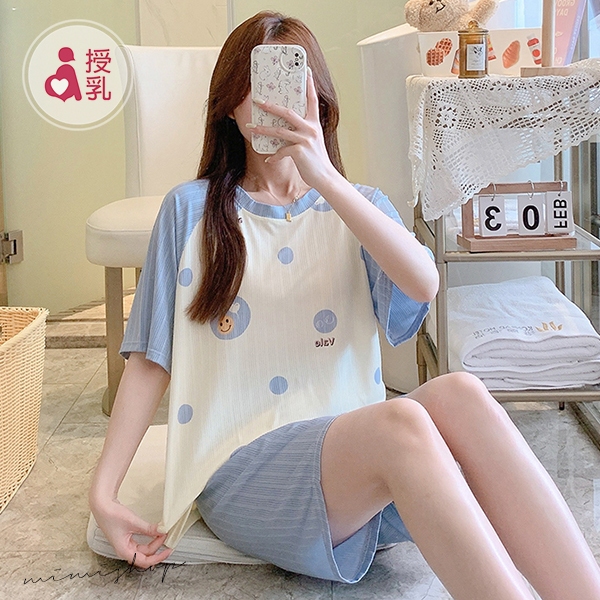 MIMI別走孕婦裝 遇見美好 針織紋透氣哺乳衣+短褲 哺乳睡衣 居家坐月子【P21373】