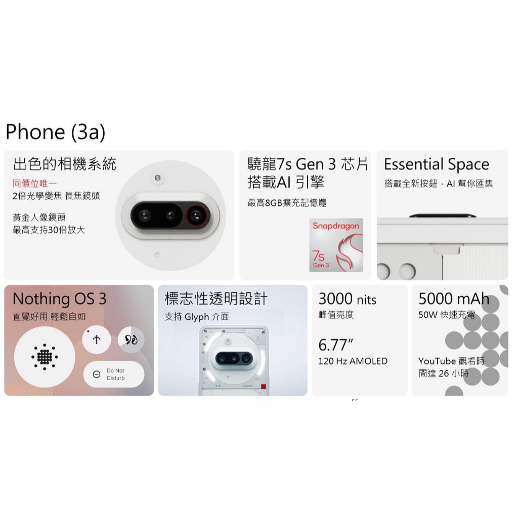 Nothing Phone (3a) 12G+256G (送原廠透明保護殼) 原廠公司貨 全新未拆12G+256G,黑|12G+256G,白|12G+256G,勿下單此項,僅查看10%蝦幣回饋同等金額miko 米可|手機門號配件專賣