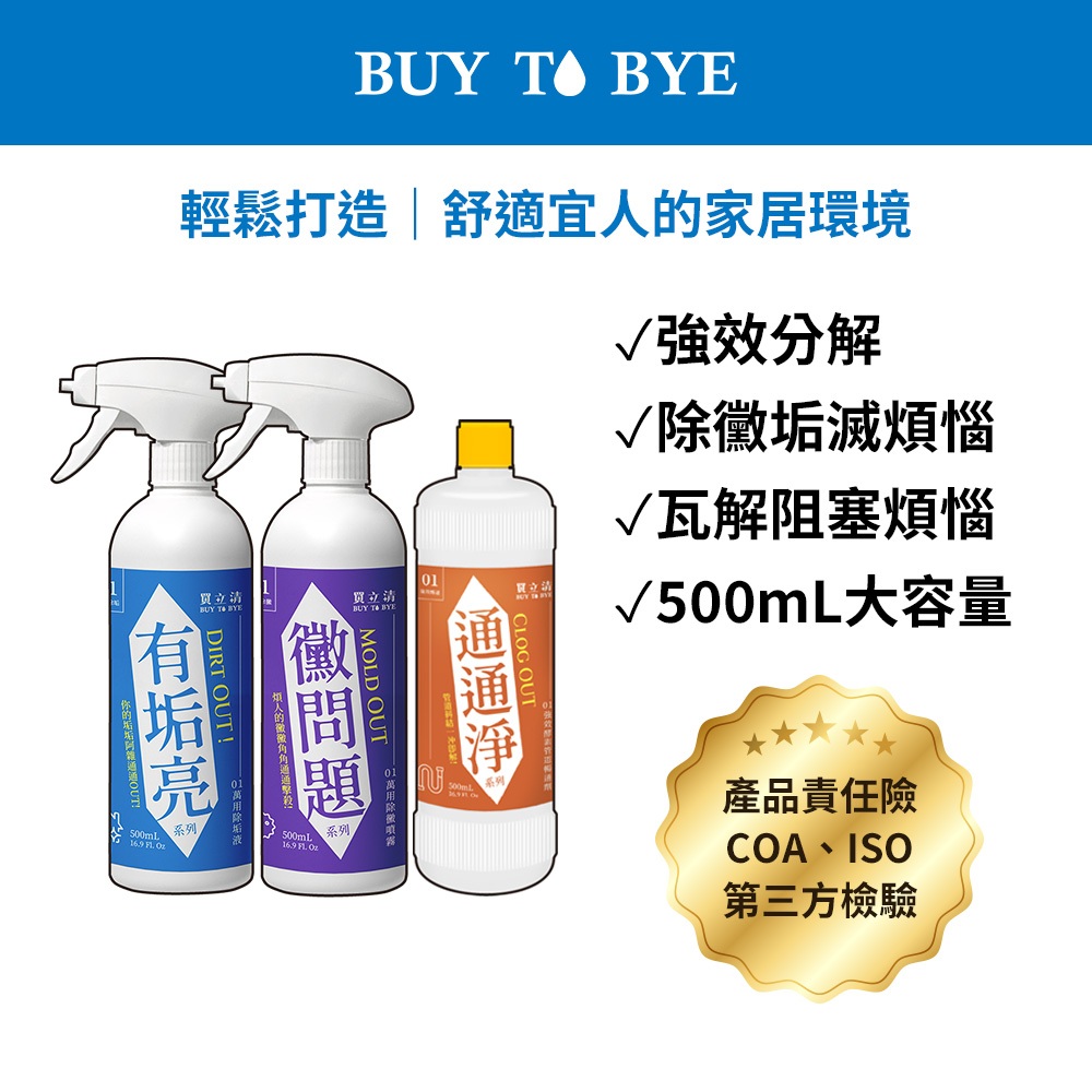 買立清® 家事清潔系列(500mL/瓶) 有垢亮+霉問題 除黴 除霉 除油 浴廁 強效 水管疏通 除垢 尿垢 鏽垢 水垢通通淨|NO1.強效酵素管道暢通劑500|有垢亮|NO1.萬用除垢液 500mL|有垢亮|NO2.強效除垢液 500mL|有垢亮|NO3.浴廁清潔液 500mL|有垢亮|NO4.水垢清潔液 500mL|有垢亮|NO5.磁磚清潔液 500mL|有垢亮|NO6.馬桶清潔液 500mL|黴問題|NO1.萬用除黴噴霧 500mL|黴問題|NO2.牆角除黴噴霧 500mLCleaning AgentsMIHONG® 米鴻生醫