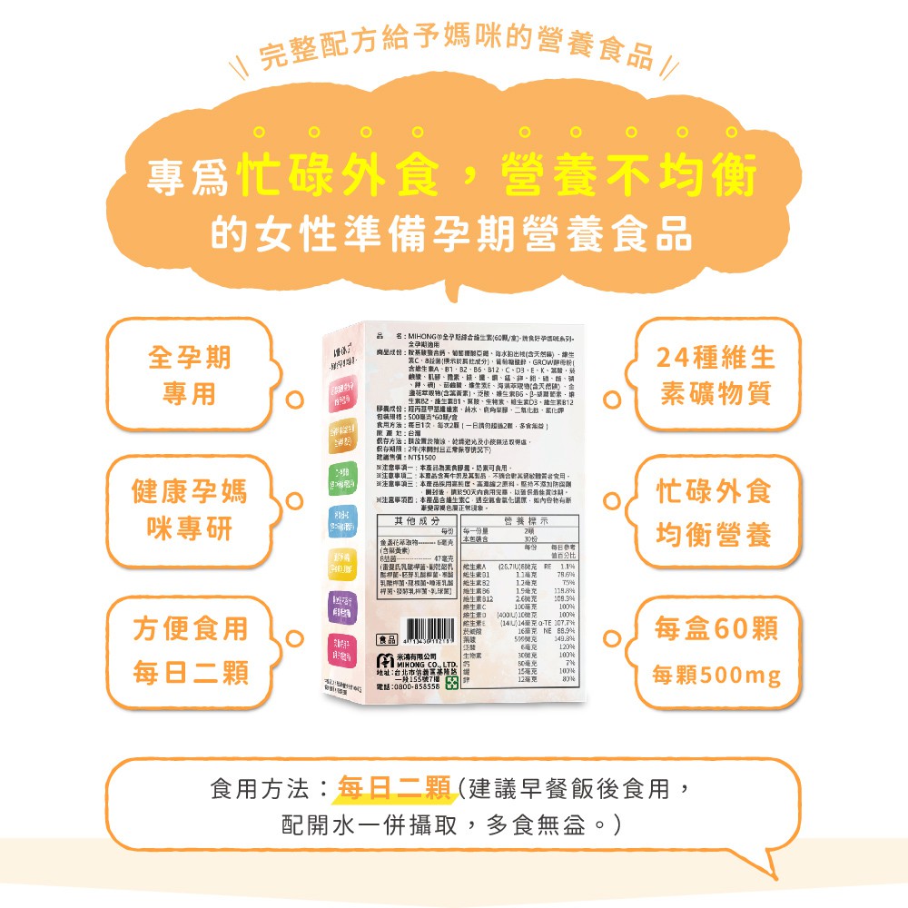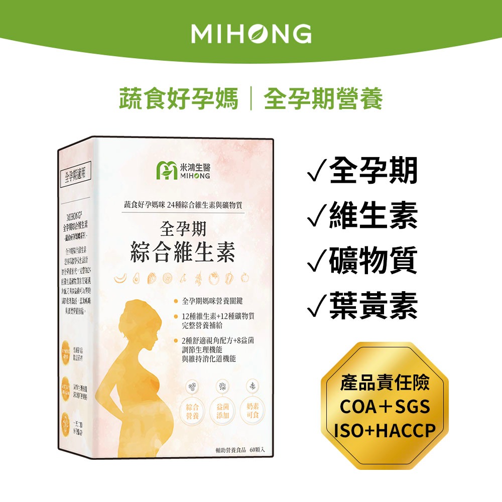 MIHONG米鴻生醫 全孕期綜合 維他命 (60顆/盒) – 【孕婦】 葉黃素 益生菌 鈣 營養品 孕期保養全孕期綜合維生素x1盒 ✅加數量更優惠✅Maternity Vitamins & SupplementMIHONG® 米鴻生醫