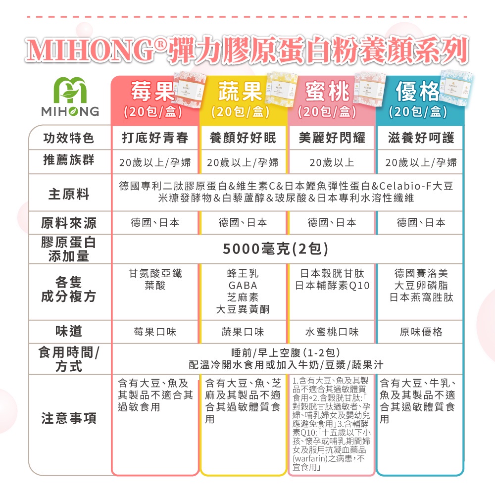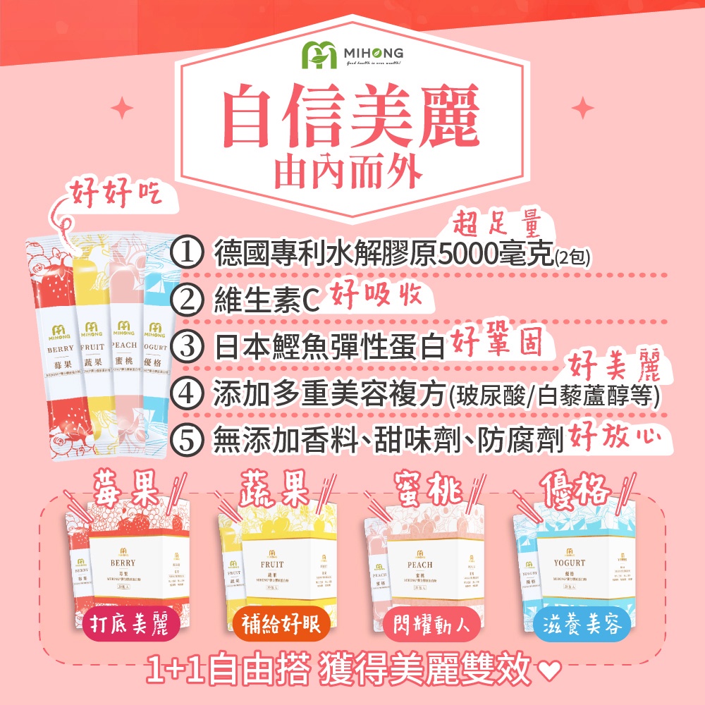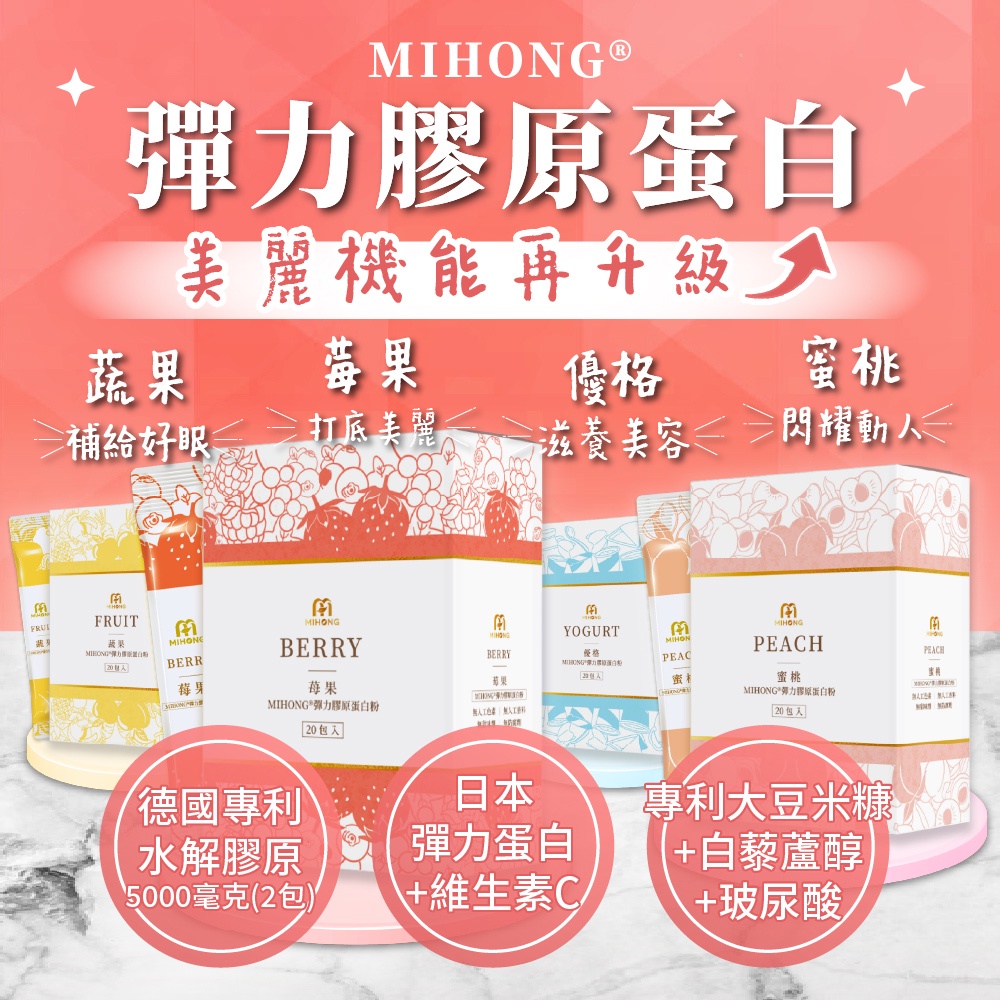 MIHONG米鴻生醫 彈力 膠原蛋白粉 膠原蛋白 維他命c 玻尿酸 葉酸 q10 鐵 白藜蘆醇 穀胱甘肽 GABA 現貨彈力膠原蛋白-莓果x1盒(20包/盒)|彈力膠原蛋白-蔬果x1盒(20包/盒)|彈力膠原蛋白-蜜桃x1盒(20包/盒)|彈力膠原蛋白-優格x1盒(20包/盒)Beauty SupplementsMIHONG® 米鴻生醫