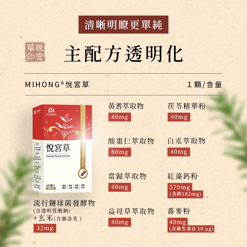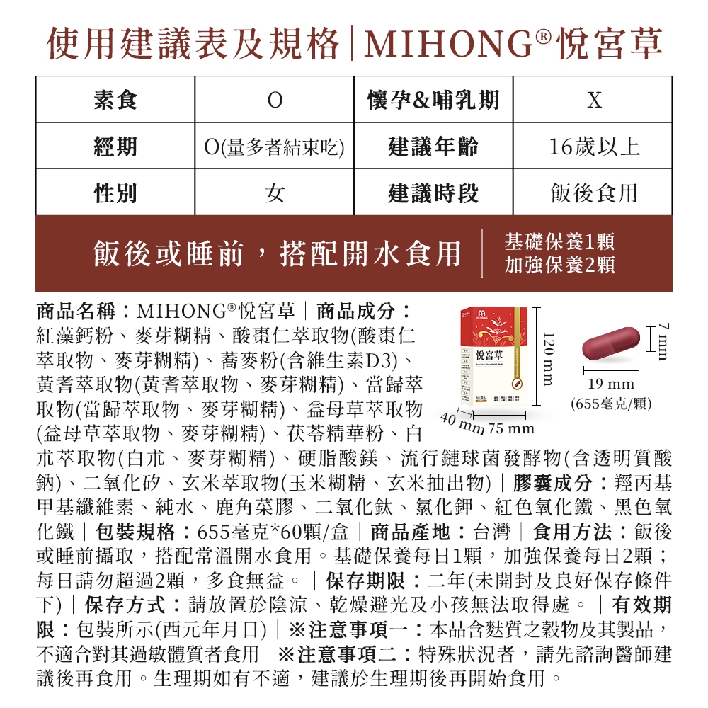 MIHONG® 悅宮草 (60顆/盒) 當歸 茯苓 酸棗仁 黃耆 益母草 白朮 玄米MIHONG® 悅宮草 (60顆/盒) 當歸 茯苓 酸棗仁 黃耆 益母草 白朮 玄米Well BeingMIHONG® 米鴻生醫