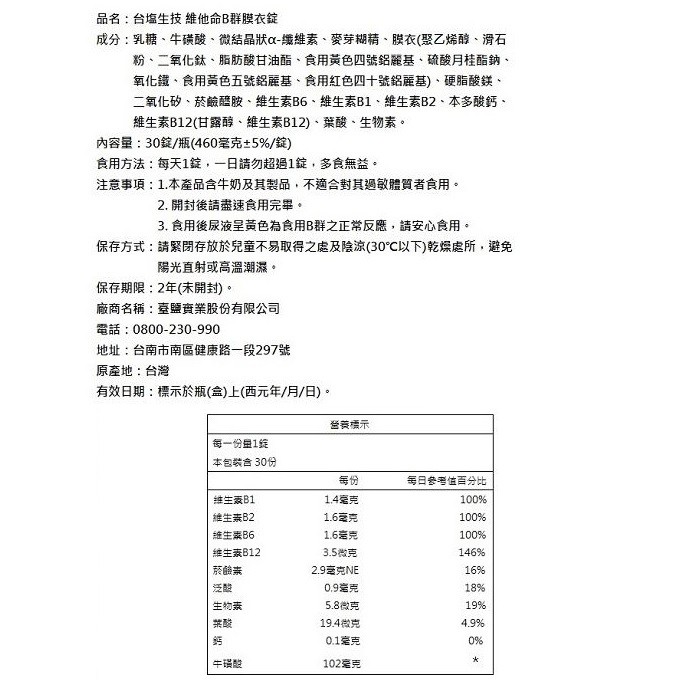 台鹽生技 維他命B群膜衣錠(30錠/罐)維他命B群Well BeingMIPA 生活百貨