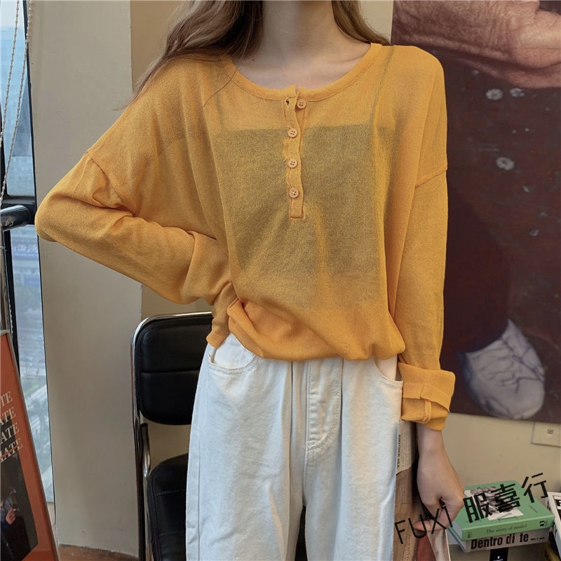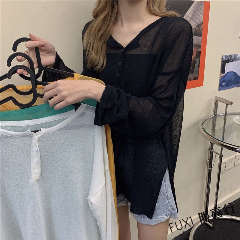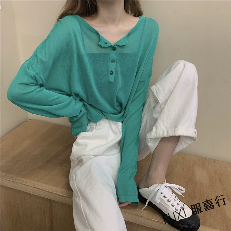 薄款防曬衫 長袖罩衫 韓版針織衫 薄款 微透上衣 寬鬆 大碼 外穿 防曬上衣潮