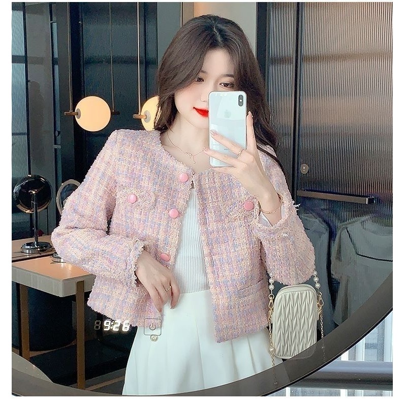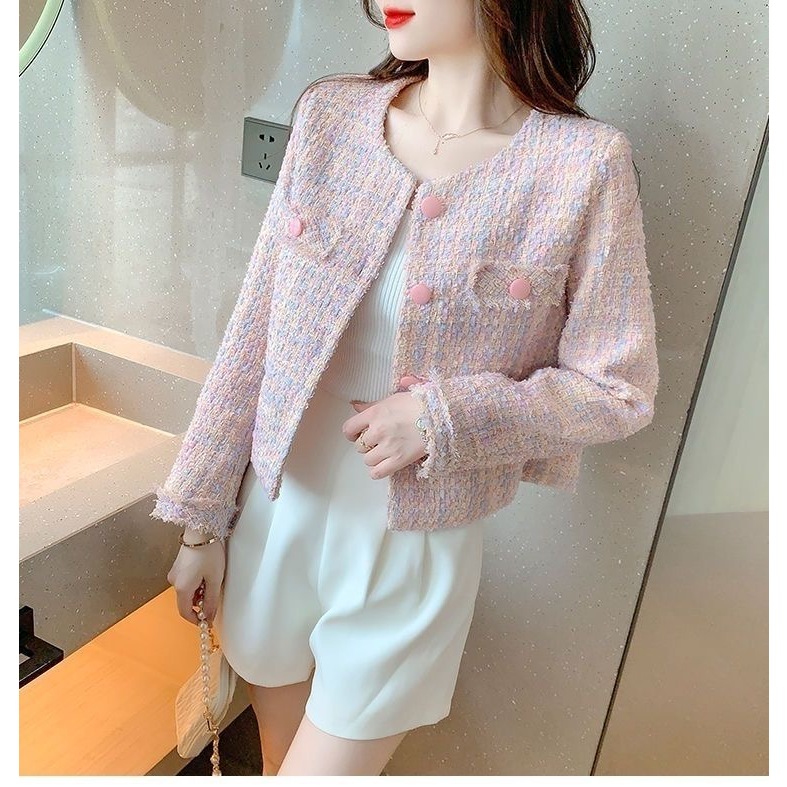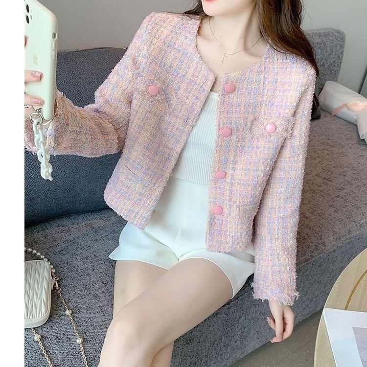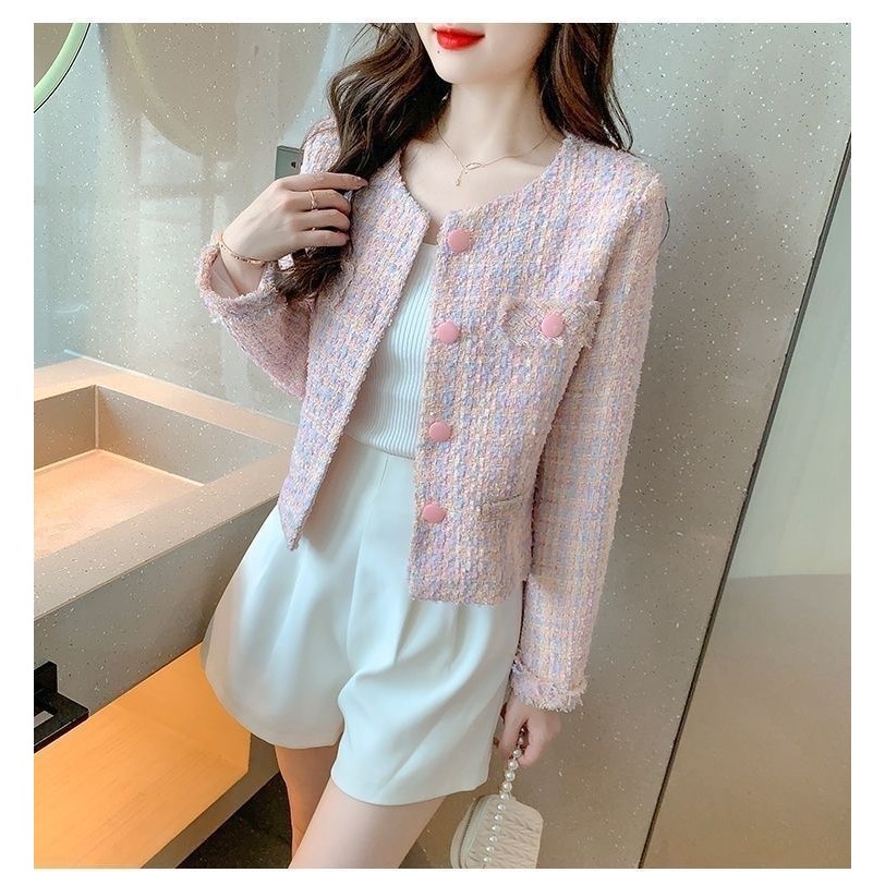 FUXI 小香風外套女 短版外套 韓版粉色氣質名媛顯瘦外套 法式高級感花呢外套 春秋長袖外套 女裝 衣服粉色,S 40-50公斤|粉色,M 50-55公斤|粉色,L 55-60公斤|粉色,XL 60-70公斤JacketsFUXI 服喜行