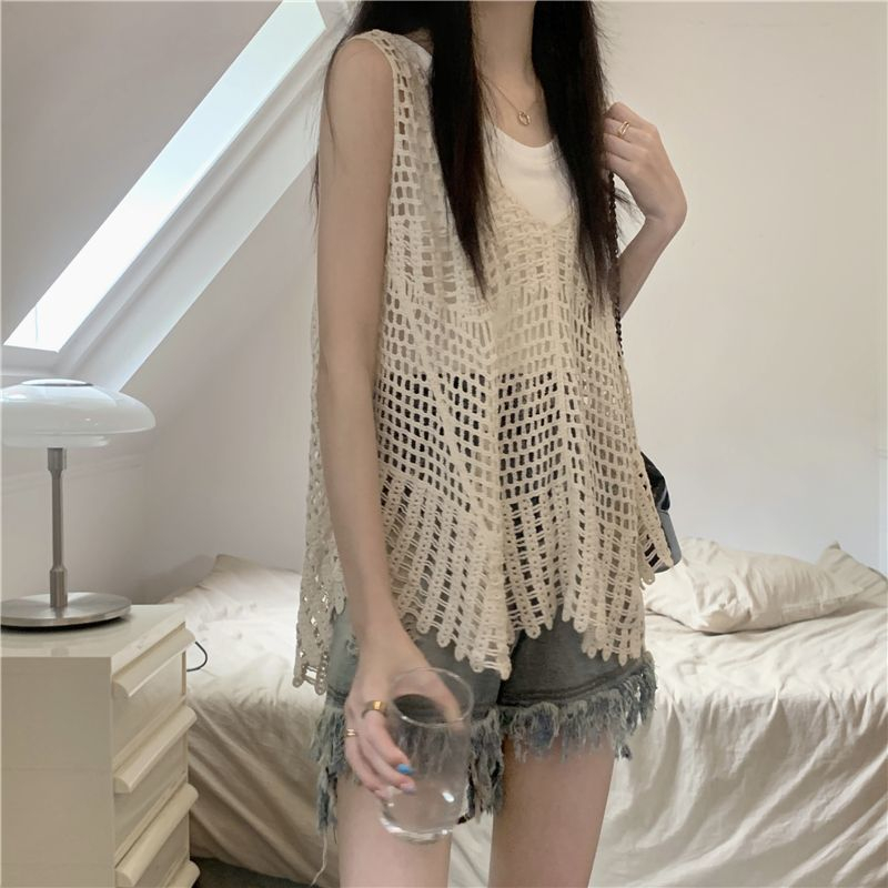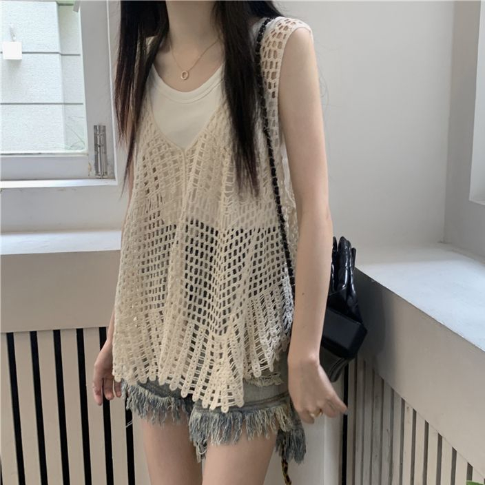 FUXI 鏤空針織馬甲女 針織背心 辣妹設計感外穿背心 無袖罩衫 長版背心 無袖上衣 女裝 衣服杏色鏤空罩衫單件,均碼 40-62公斤|白色鏤空罩衫單件,均碼 40-62公斤Tanks & CamisolesFUXI 服喜行