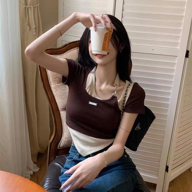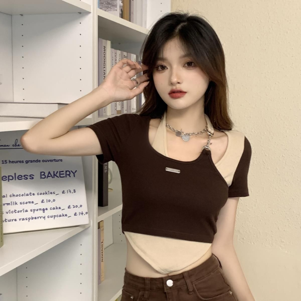 FUXI 不規則假兩件掛脖短袖t恤女 辣妹設計感上衣 短版上衣 夏季短袖 女裝 衣服假兩件棕色-短袖,均碼 35-62公斤T-shirtsFUXI 服喜行