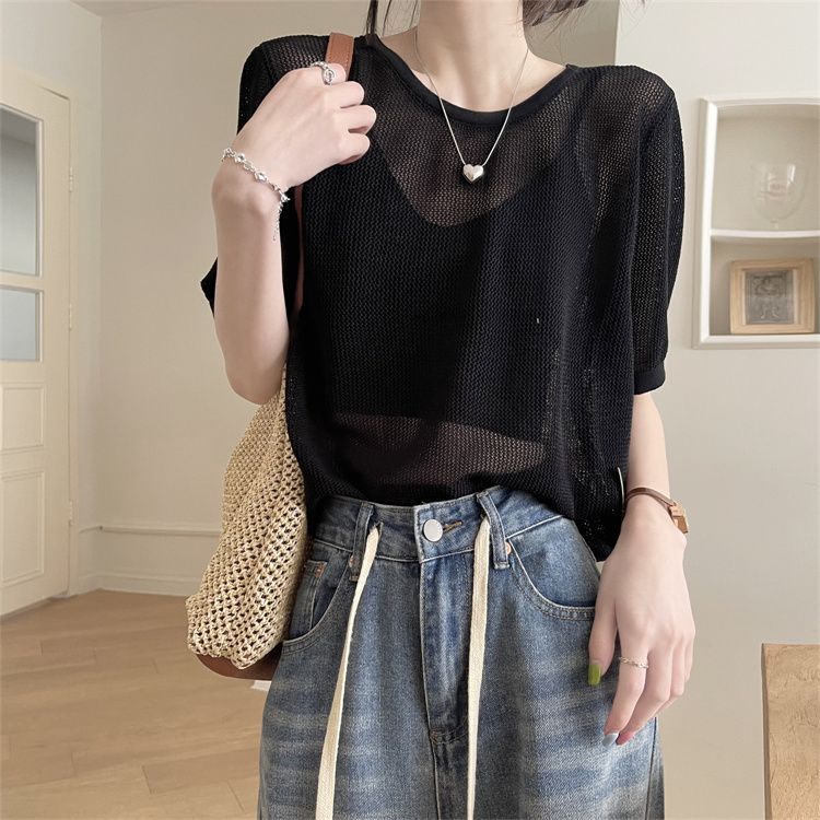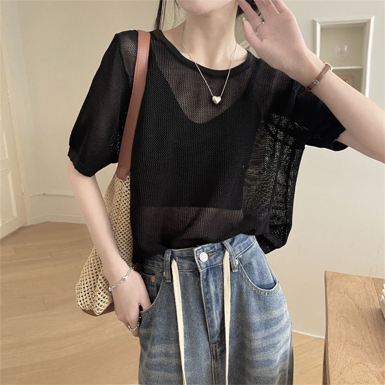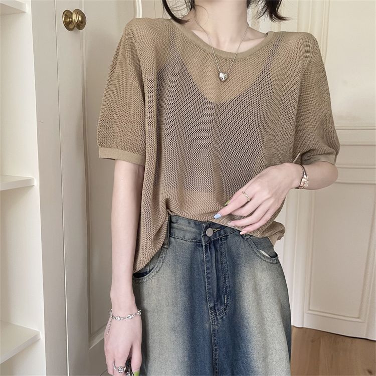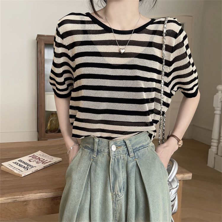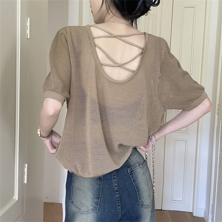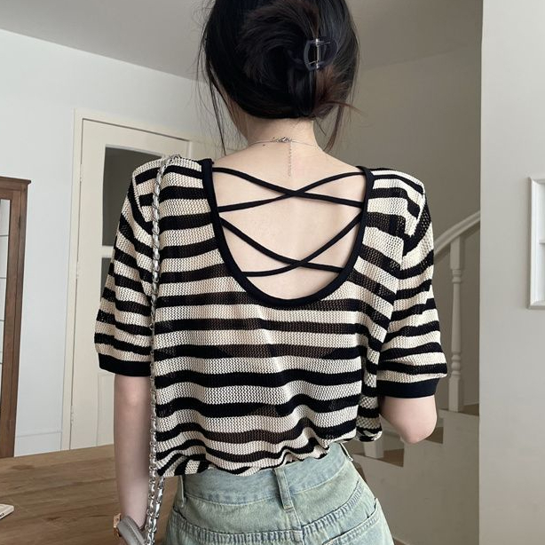 FUXI 韓版寬鬆鏤空短袖針織上衣女 美背露背上衣 短袖上衣 薄款套頭針織衫 罩衫 針織衫 女裝 衣服黑色,均碼 40-60公斤|卡其,均碼 40-60公斤|條紋,均碼 40-60公斤FUXI 服喜行