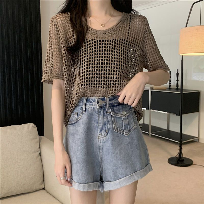 FUXI 短袖鏤空罩衫女 薄款針織上衣 寬鬆短袖上衣 短版上衣 外搭 透膚上衣 針織衫 女裝 衣服
