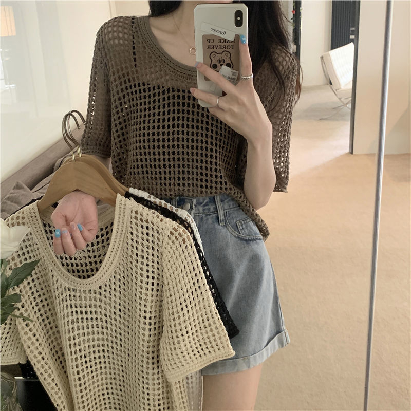 FUXI 短袖鏤空罩衫女 薄款針織上衣 寬鬆短袖上衣 短版上衣 外搭 透膚上衣 針織衫 女裝 衣服杏色,均碼 38-62公斤|白色,均碼 38-62公斤|黑色,均碼 38-62公斤|卡其色,均碼 38-62公斤FUXI 服喜行