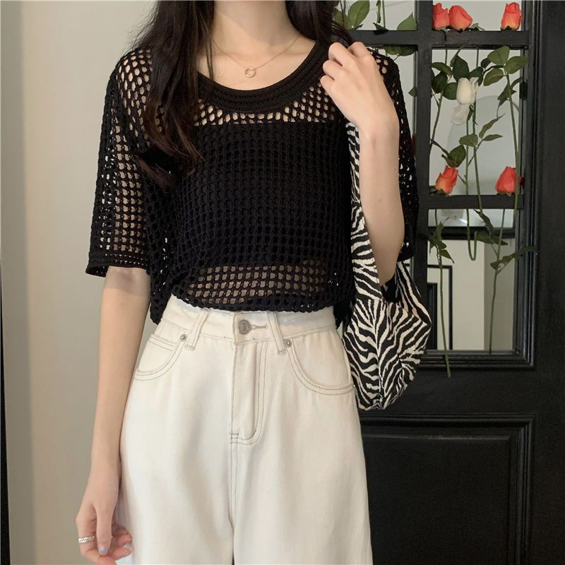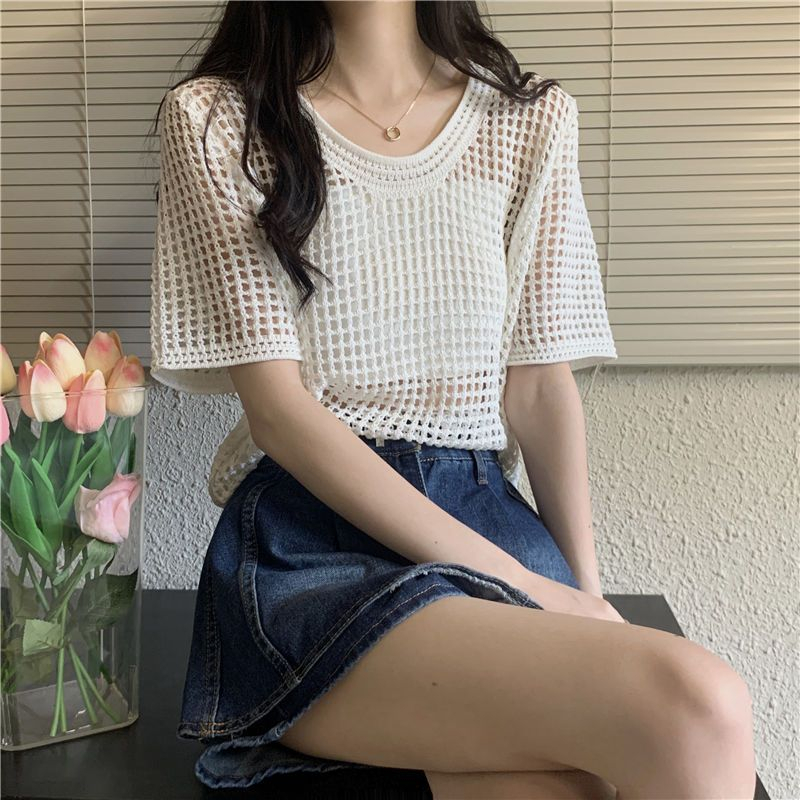 • FUXI 短袖鏤空罩衫女 薄款針織上衣 寬鬆短袖上衣 短版上衣 外搭 透膚上衣 針織衫 女裝 衣服