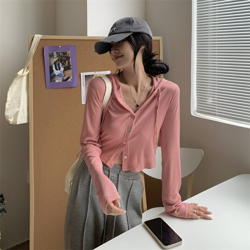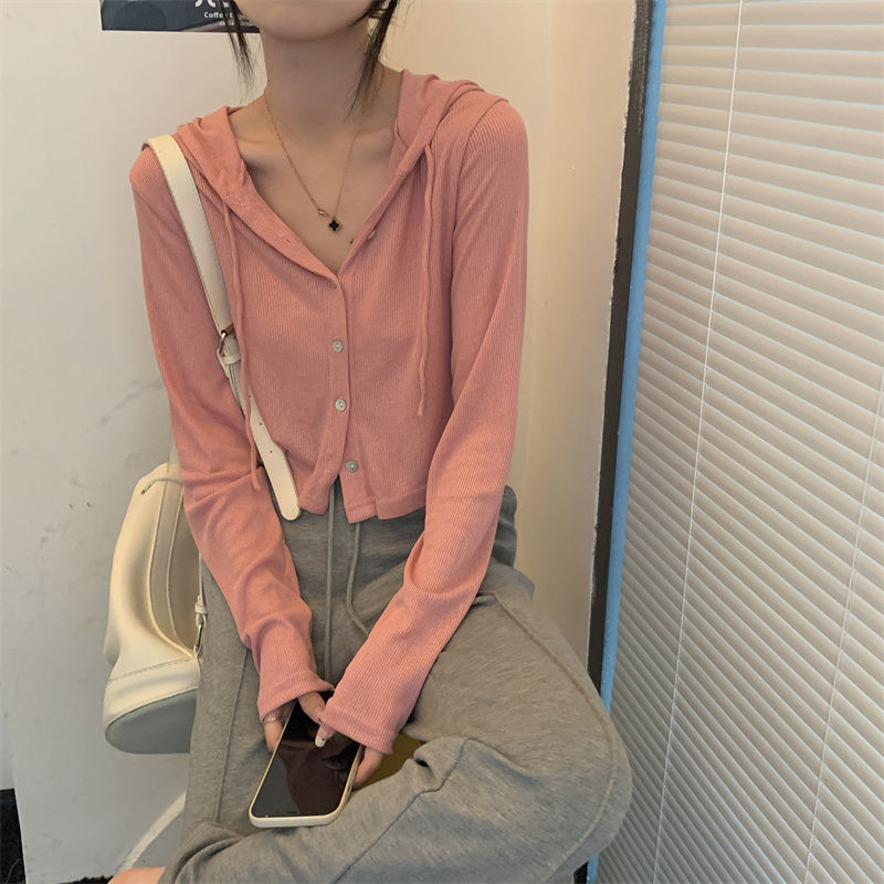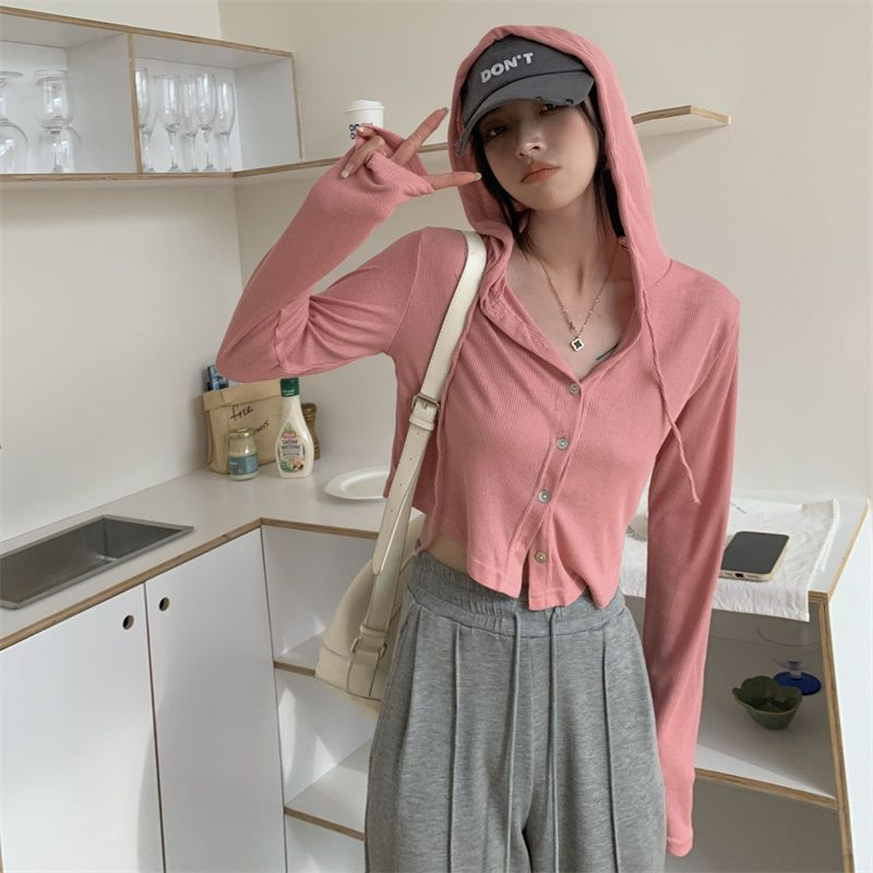 • FUXI 韓版連帽長袖短外套女 開衫外套 慵懶風修身短版外套 長袖上衣 素色小外套