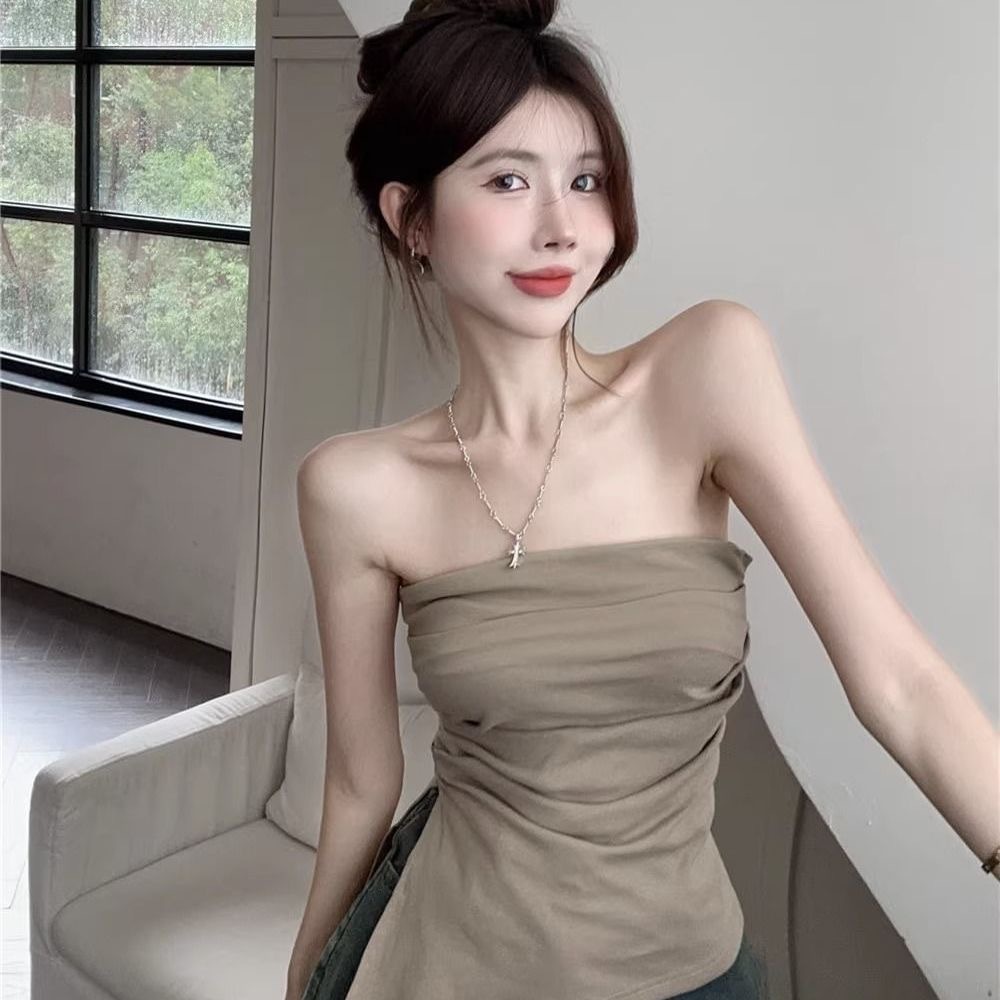 FUXI 上衣女 抹胸 外穿背心 無袖上衣 不規則開叉收腰內搭上衣 打底上衣 小可愛 平口背心 女裝 衣服黑色,均碼 40-62公斤|卡其色,均碼 40-62公斤Tube TopsFUXI 服喜行