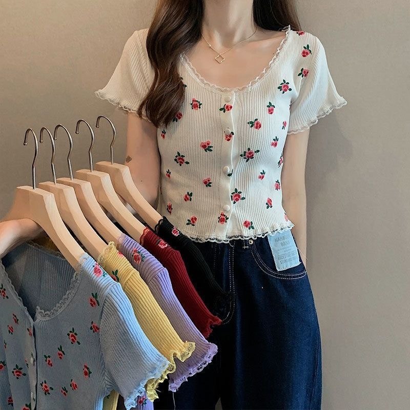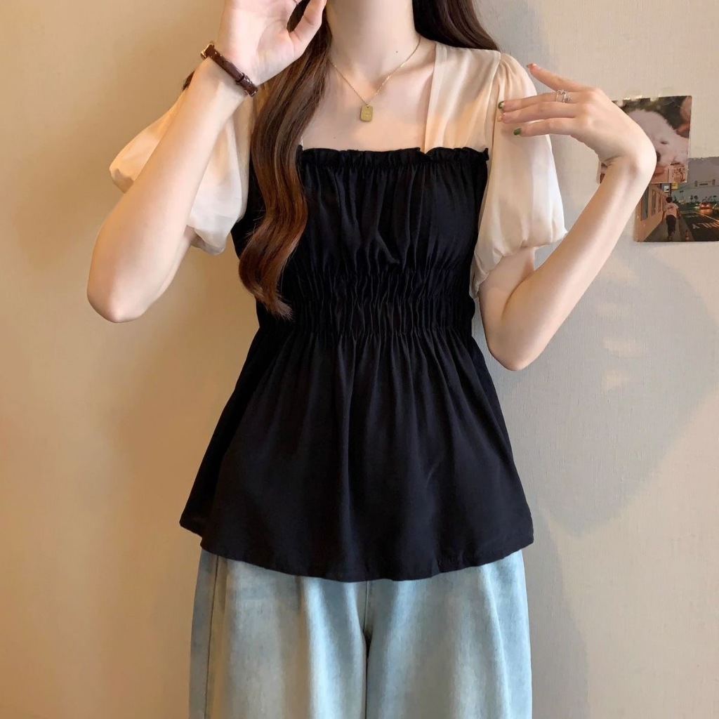 FUXI 雪紡襯衫女 短袖襯衫 收腰顯瘦方領襯衫 法式泡泡袖上衣 大尺碼微胖上衣 女裝 衣服