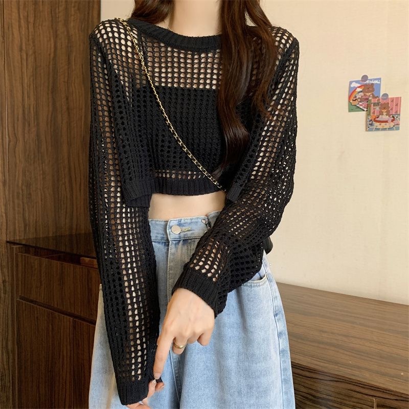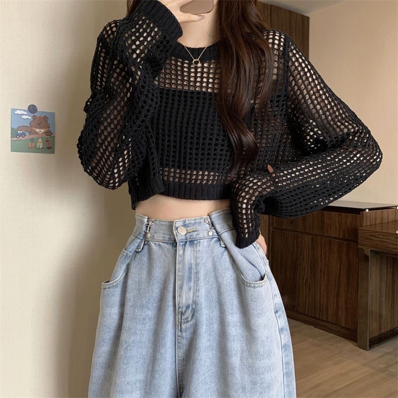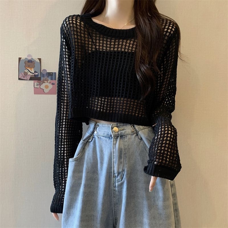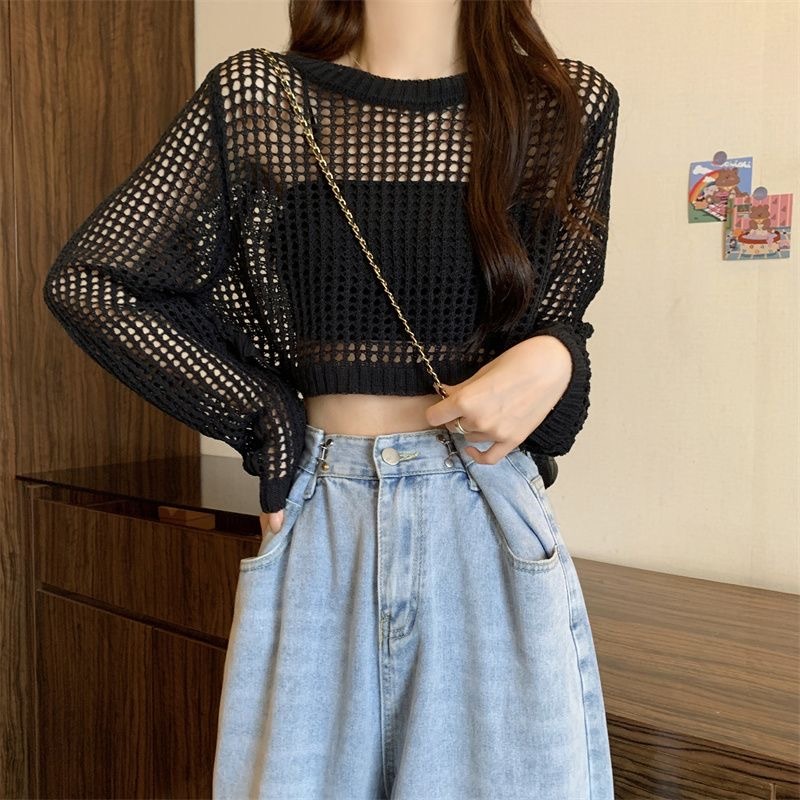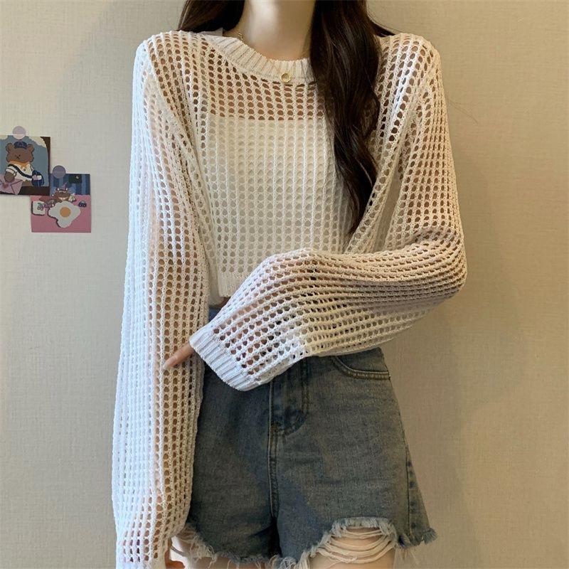 FUXI 鏤空罩衫 長袖針織上衣女 寬鬆外穿短板罩衫 防曬衫 外搭薄款針織衫 女裝 衣服 女生上衣 辣妹上衣白色罩衫(不含背心),均碼 40-60公斤|黑色罩衫(不含背心),均碼 40-60公斤|花灰罩衫(不含背心),均碼 40-60公斤FUXI 服喜行